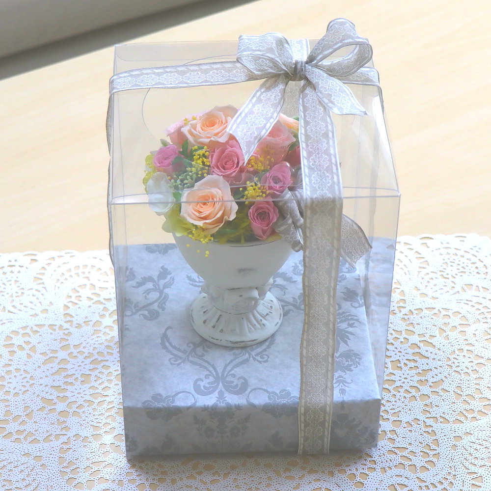 資材・ラッピング: ホワイトローズ花器、リボン、ギフト用クリアケース付き、フラワーケアカード(取扱説明書)