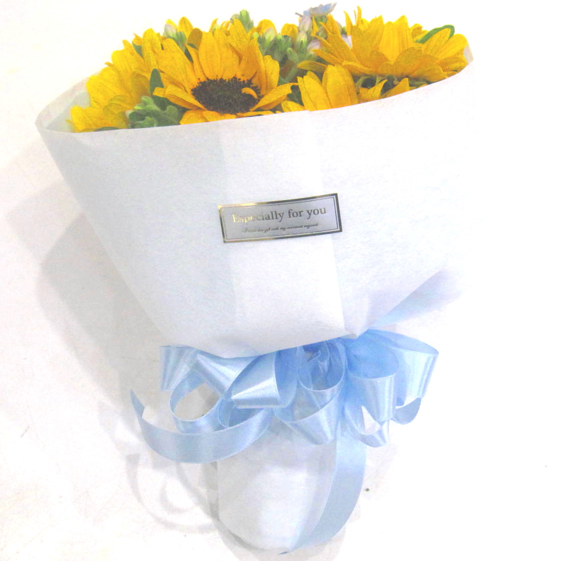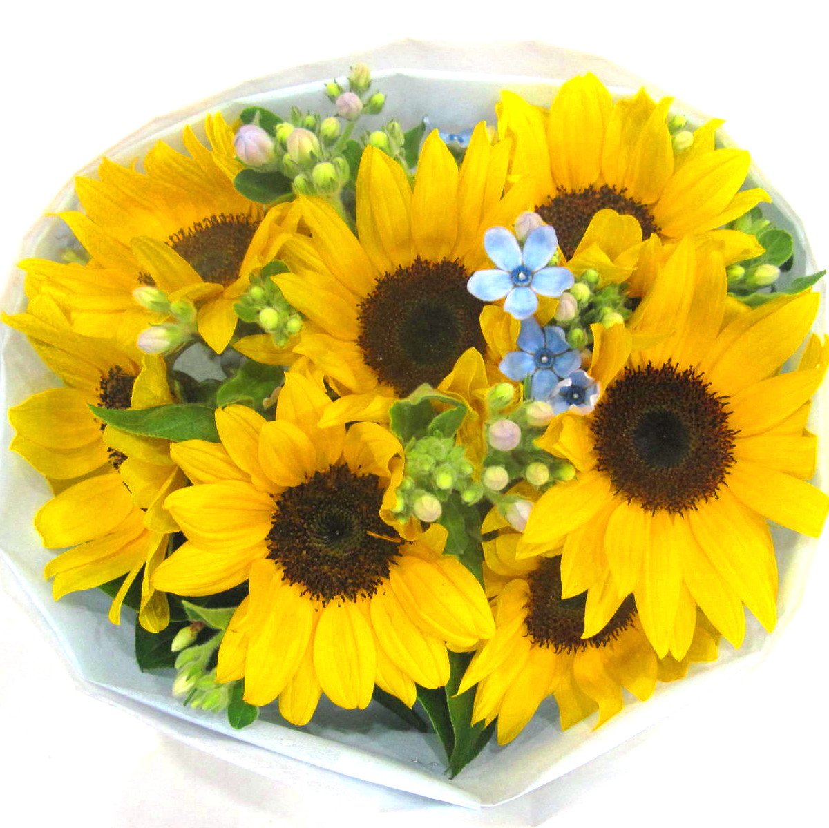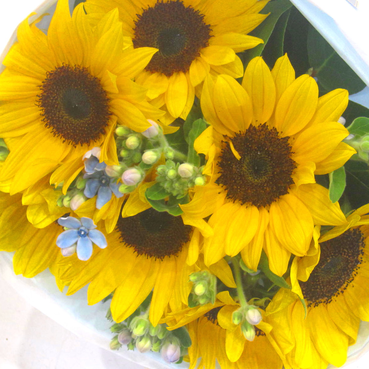 存在感のある夏を代表するお花「ヒマワリ」と一際目を惹くスター咲きの青い花「ブルースター」を合わせた可愛い花束。※こちらの商品についてのご相談、ご質問等ございましたら(メール)または(お電話)にて承ります。