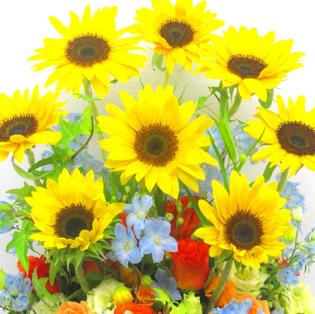 花材: メイン ヒマワリ、バラ、ミニカーネーション、トルコギキョウ、デルフィニュームなど その他 実物類、葉物類など