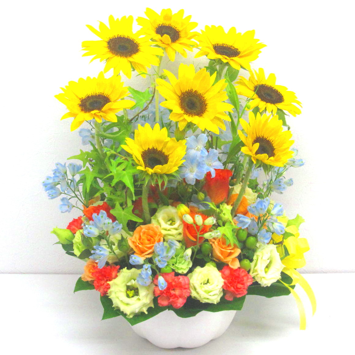 夏を代表するヒマワリを主体にしたアレンジメント。大切な日をきっと祝福してくれるような雰囲気です。夏のさまざまなギフトにオススメですよ。【15時迄のご注文で翌日届きます】※こちらの商品についてのご相談、ご質問等ございましたら(メール)または(お電話)にて承ります。
