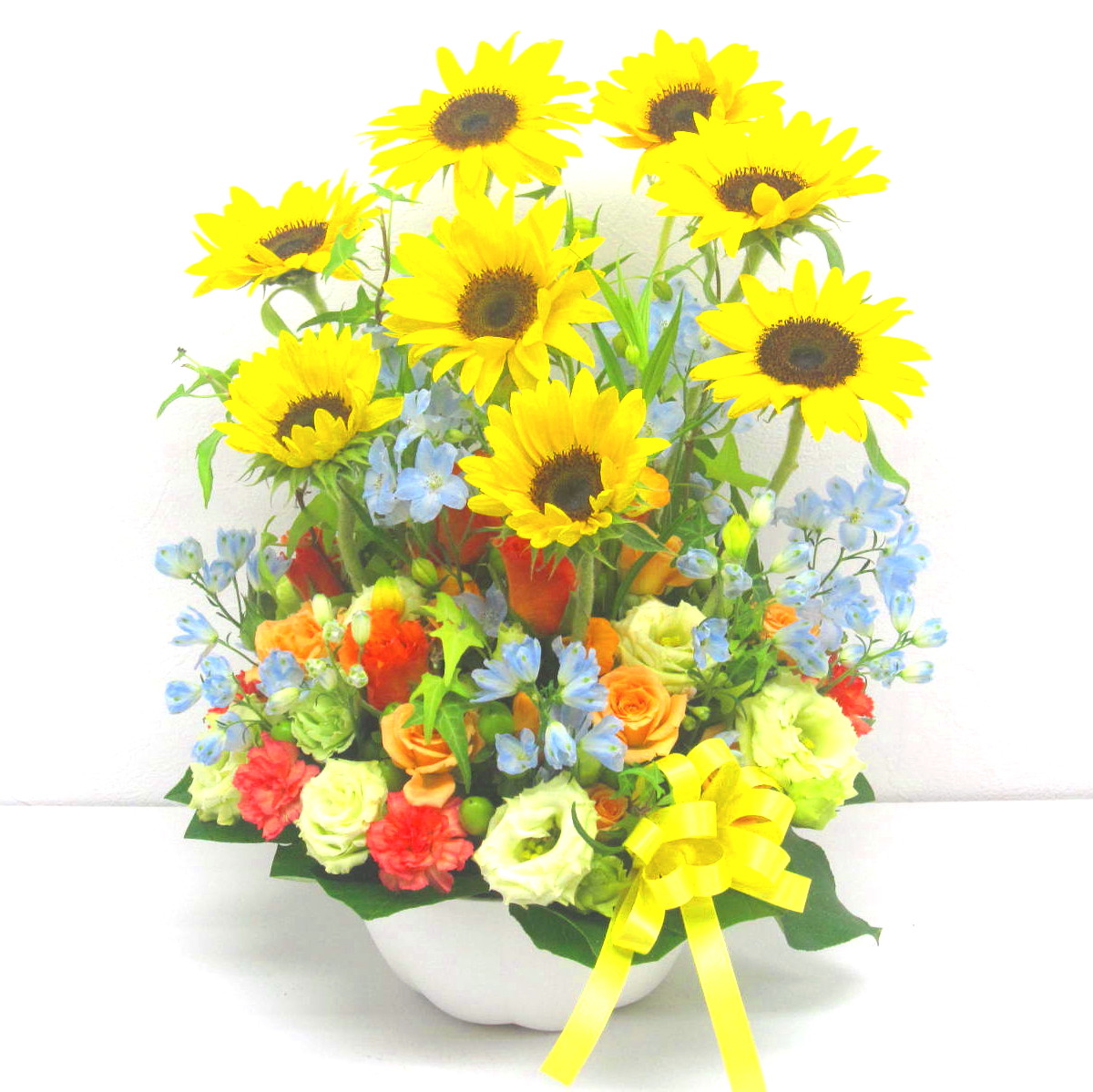 ヒマワリをトップに飛び出させた華やかなアレンジメントです。その他に色々なお花が大切な日を賑やかに演出してくれますよ。また、ご利用されたお客様から「大変花持ちが良い」と好評をいただいております。静岡県長泉町から日本全国【真心】込めてお届けいたします。さまざまなシーンの贈り物としてオススメです。大切な方へ贈るフラワーギフトやプレゼントなら「花樹園オンラインドットコム」に是非、お任せ下さいませ。