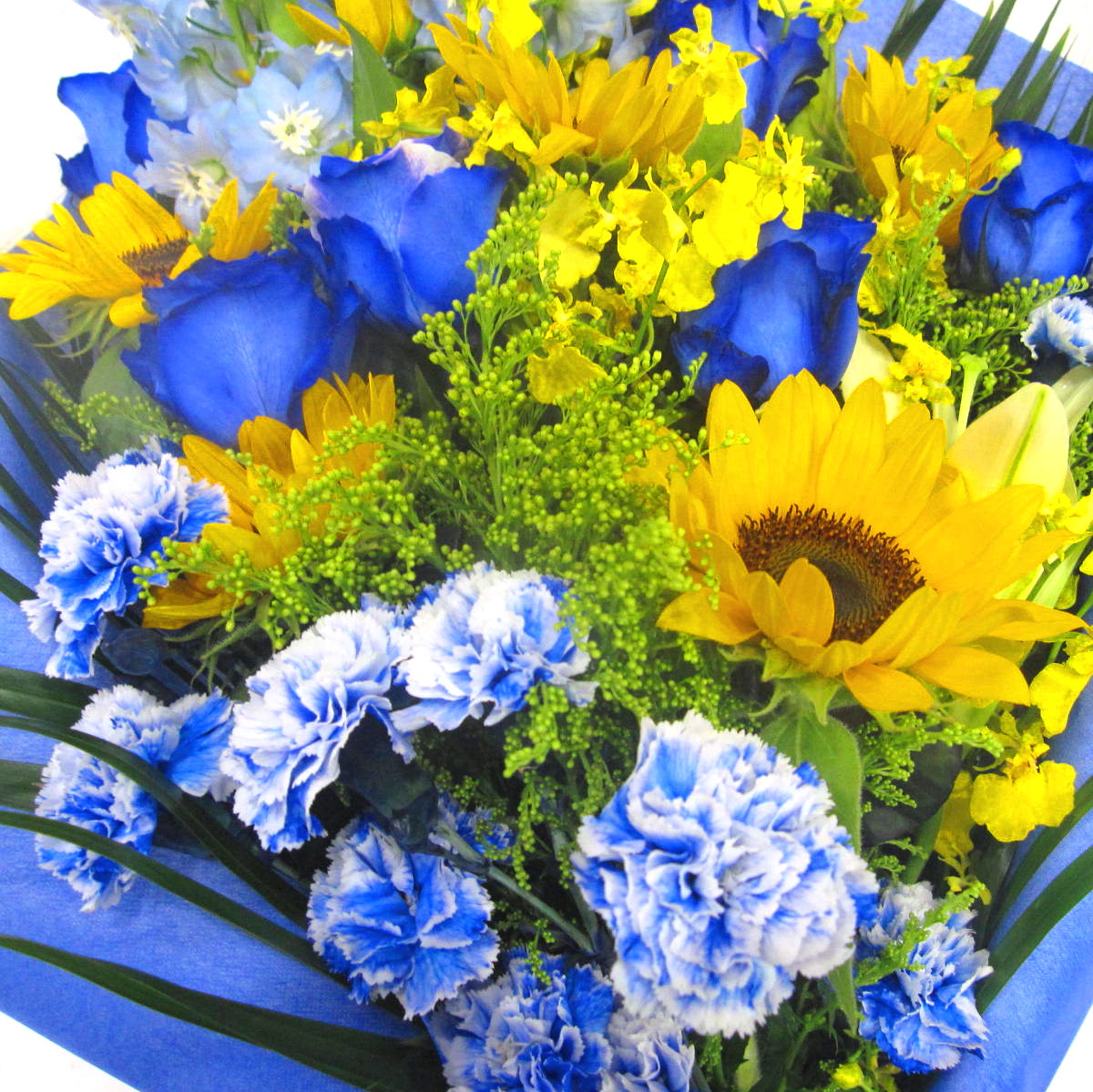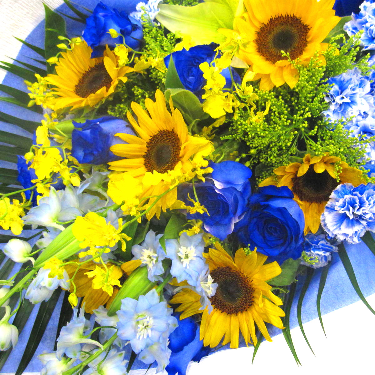 花材: メイン 【オリジナル染色】青いバラ、ユリ、カーネーション、オンシジューム、デルフィニュームなど その他 葉物類など