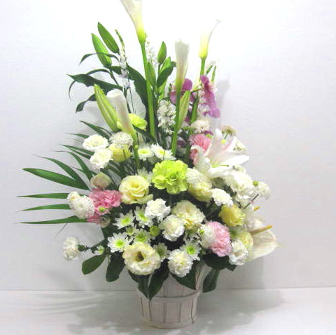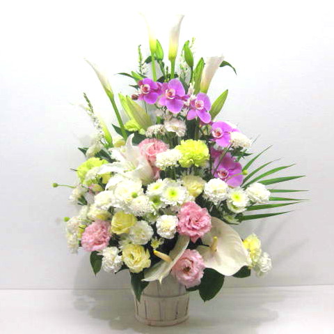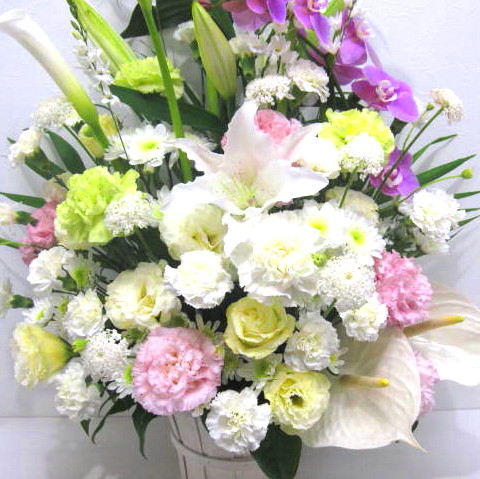 花材: メイン ユリ、マム、カーネーション、蘭系のお花など その他 葉物類など