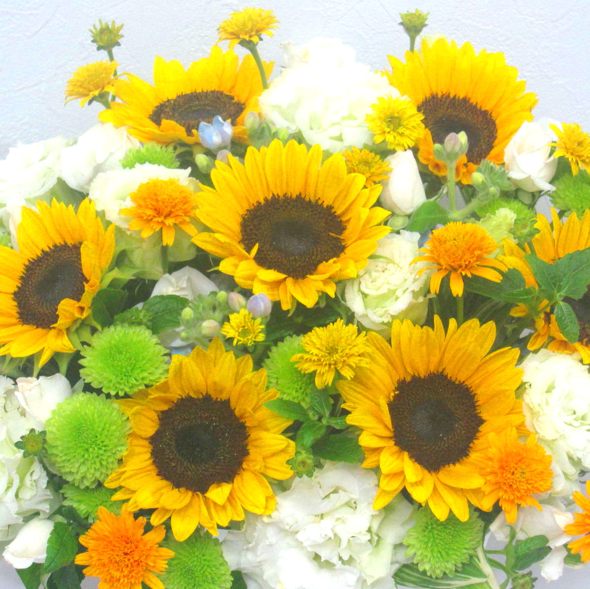 花材: メイン ひまわり、トルコギキョウ、スプレーマムなど その他 季節の小花、葉物類など