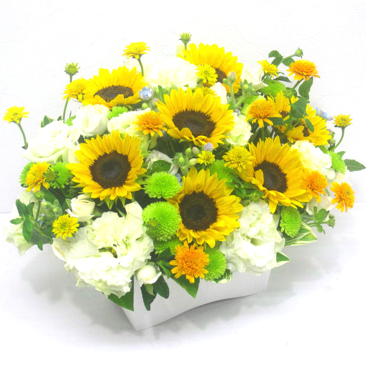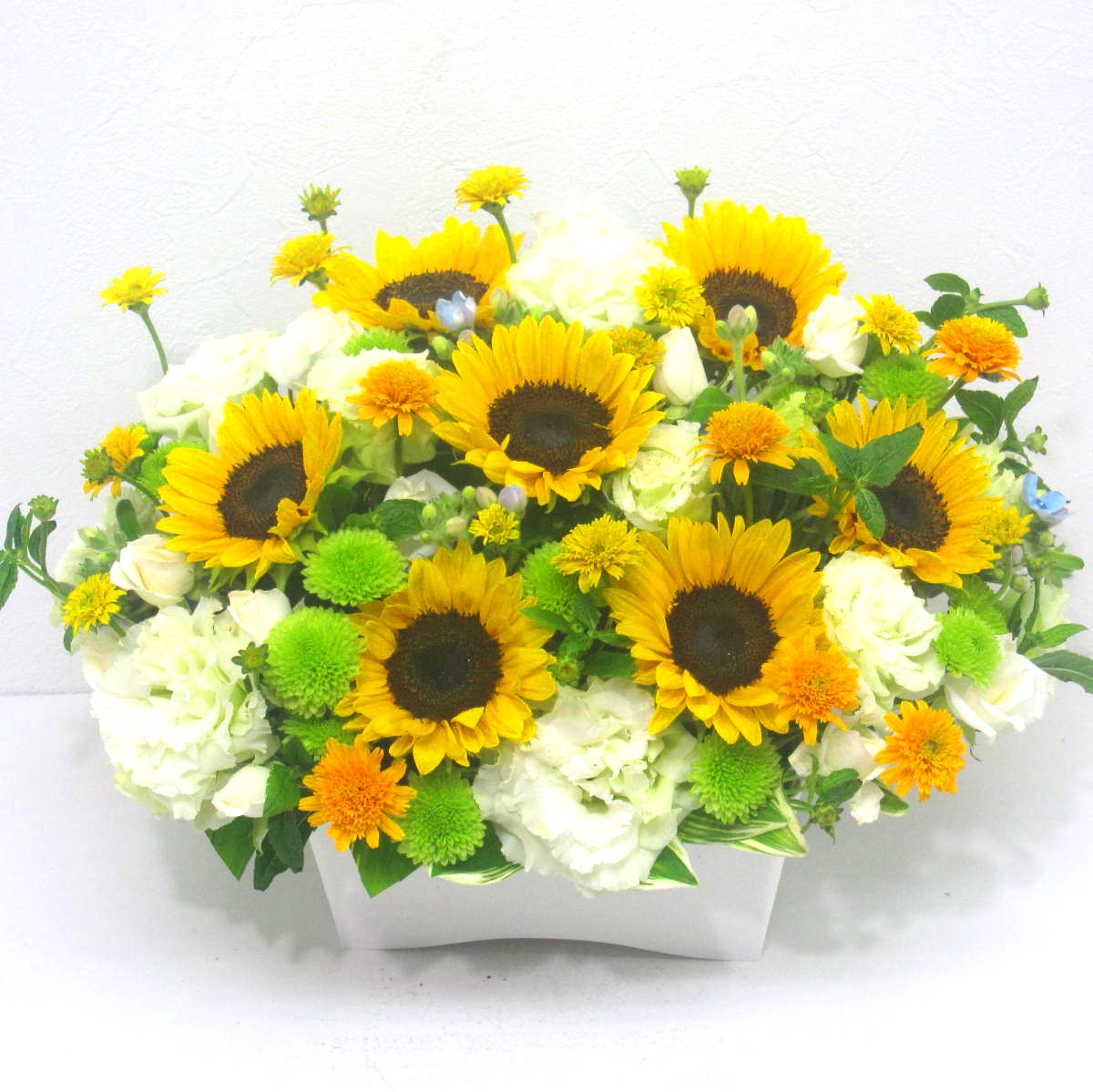 ヒマワリを中心に優しい色合いのお花が入った素敵なアレンジメントです。このお花を見て心が和み、明日へのエネルギーになるように…魂を込めて制作いたします。また、持ちの良いお花を中心に使っておりますので花持ちも良いでしょう。ご購入されたお客様から高い評価を頂いております。静岡県長泉町から日本全国【真心】込めてお届けいたします。さまざまなご用途に贈る贈り物としてオススメです。大切な方へ贈るフラワーギフトやプレゼントなら「花樹園オンラインドットコム」に是非、お任せ下さいませ。