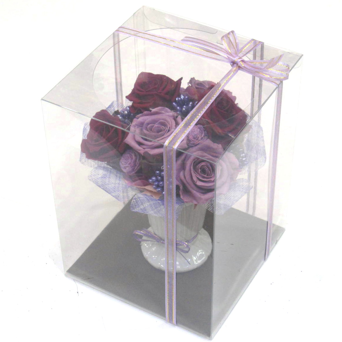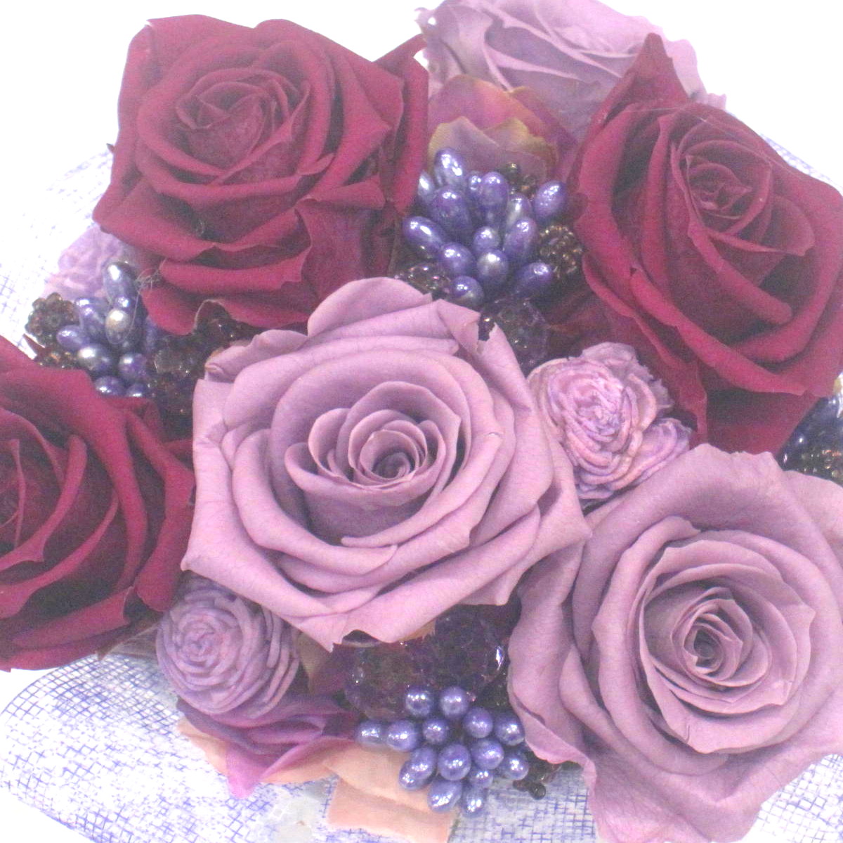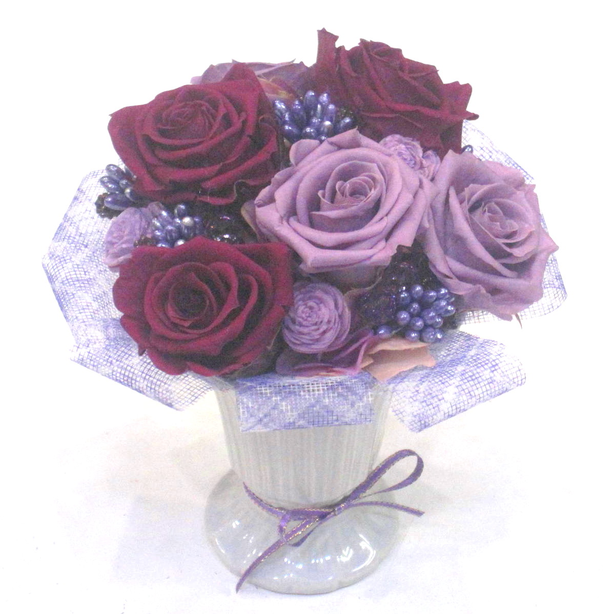 紫色の貴賓が漂うプリザーブドフラワーです。紫色の濃淡のプリザーブドローズを中心に素敵にお作りします。高級感のある素敵なデザインは「特別な日」をいつまでも色あせない記憶に残る日となることでしょう。貰って嬉しい特別な贈り物です。当店ではお客様の想い大切に【こころを込めて】お作りいたします。静岡県駿東郡長泉町から日本全国へお届けします。是非、想いを込めたフラワーギフトにいかがですか!?