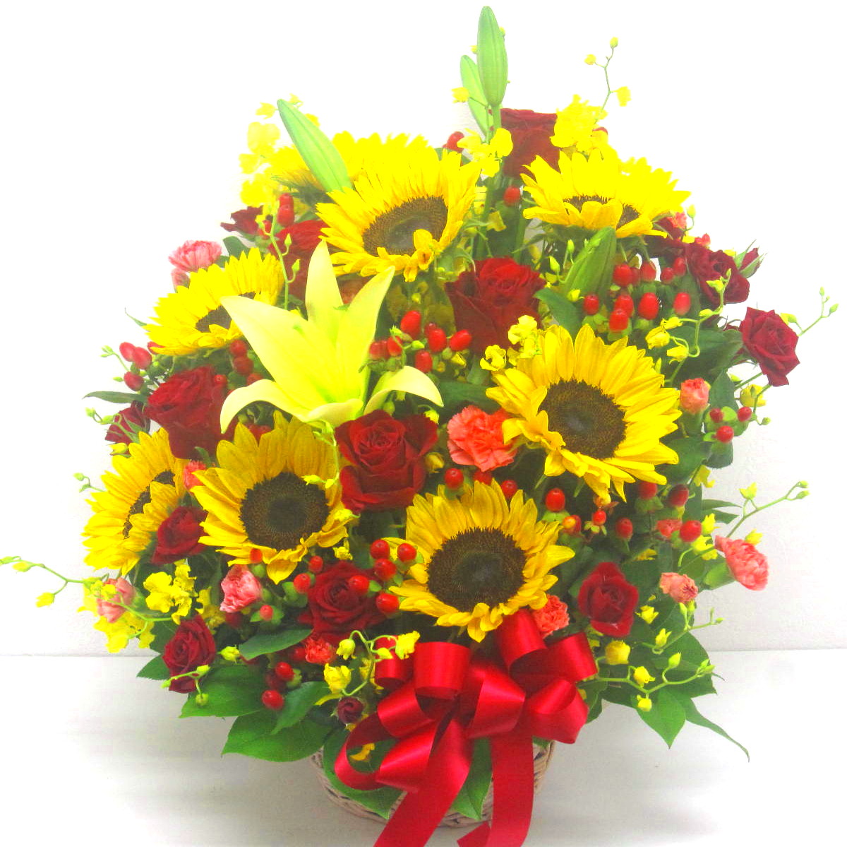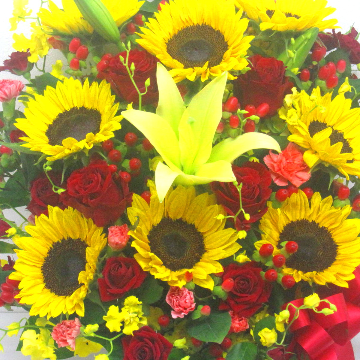 ヒマワリを主体の赤いバラなど存在感のあるお花も入れた華やかなアレンジメントです。お誕生日や開店・開業祝い、劇場・発表会などに人気があります。また、持ちの良いお花を中心に使っておりますので花持ちも良いでしょう。ご購入されたお客様から高い評価を頂いております。静岡県長泉町から日本全国【真心】込めてお届けいたします。さまざまなご用途に贈る贈り物としてオススメです。大切な方へ贈るフラワーギフトやプレゼントなら「花樹園オンラインドットコム」に是非、お任せ下さいませ。