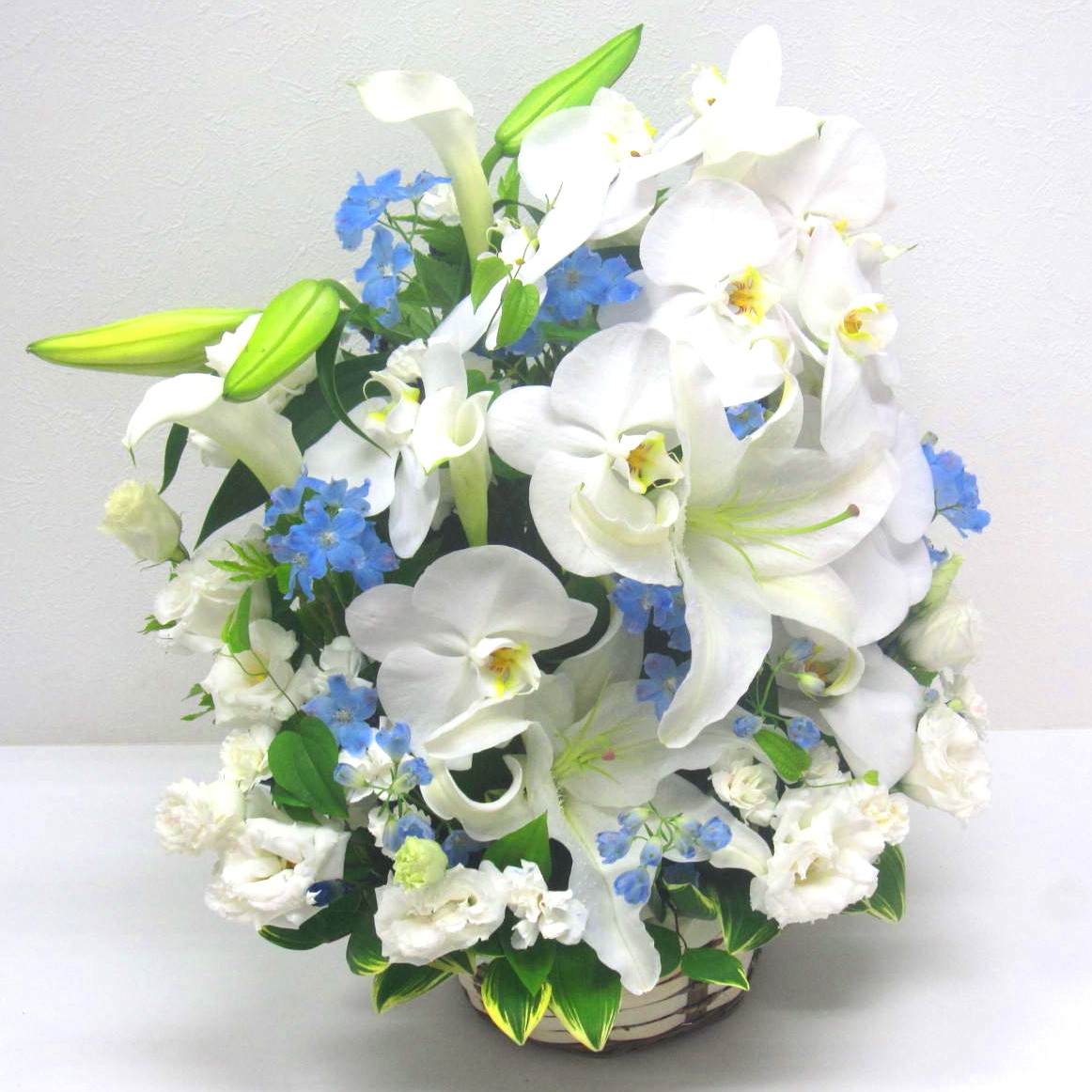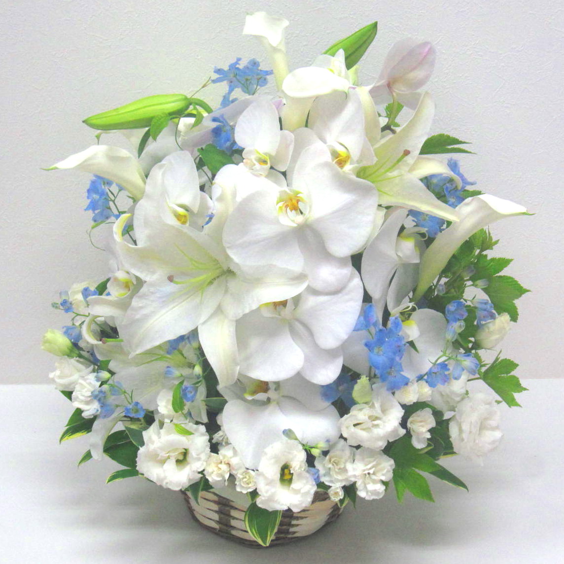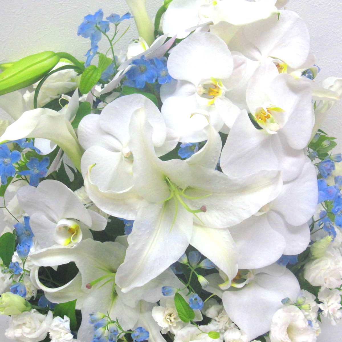 カサブランカと胡蝶蘭をあわせて淡い水色のデルフィニュームを入れたったお供え用アレンジメント。※こちらの商品についてのご相談、ご質問等ございましたら(メール)または(お電話)にて承ります。