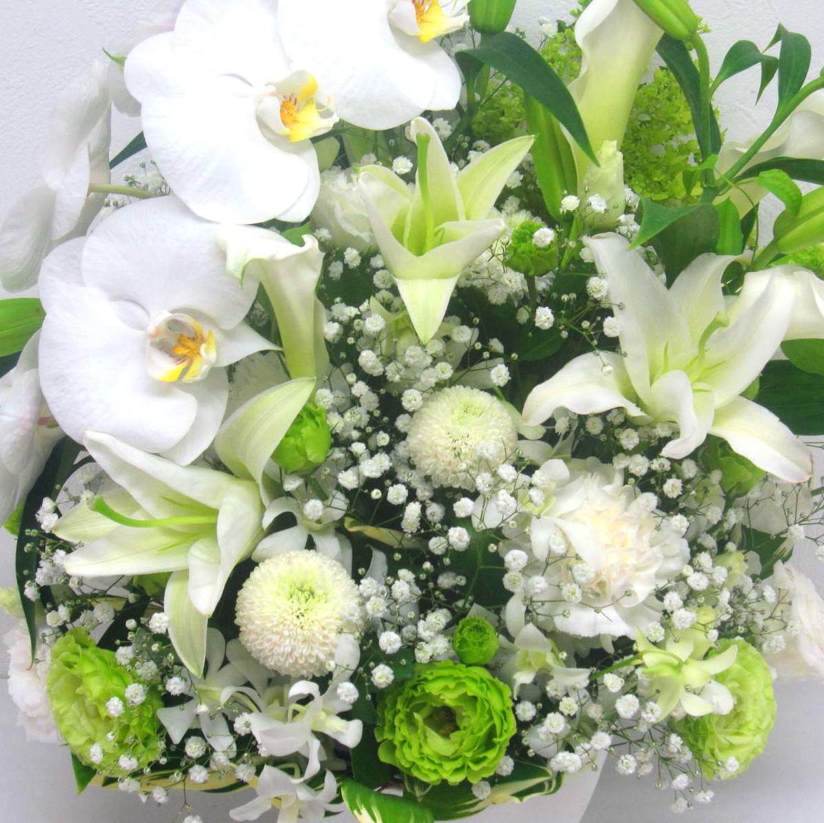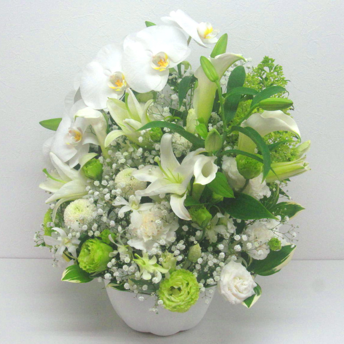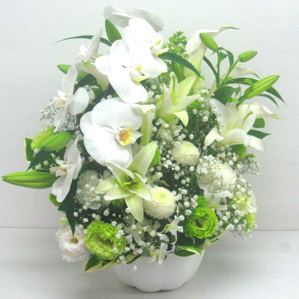 高級なお花「コチョウラン」とユリを中心にした白&グリーン系アレンジメント。ナチュラルで優しい色合いが優しく故人を偲びます。【15時迄のご注文で翌日届きます】※こちらの商品についてのご相談、ご質問等ございましたら(メール)または(お電話)にて承ります。