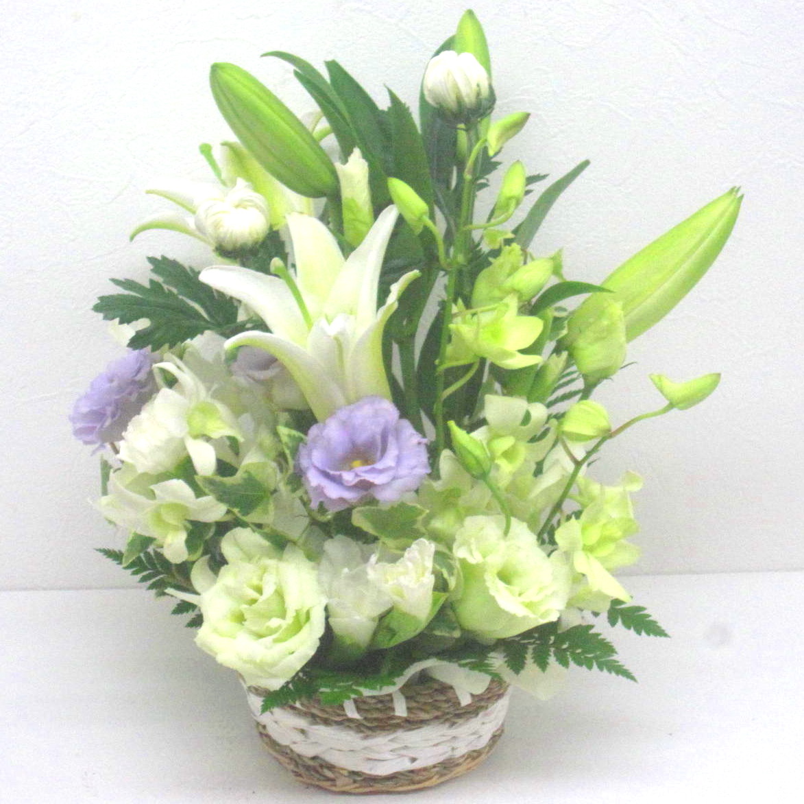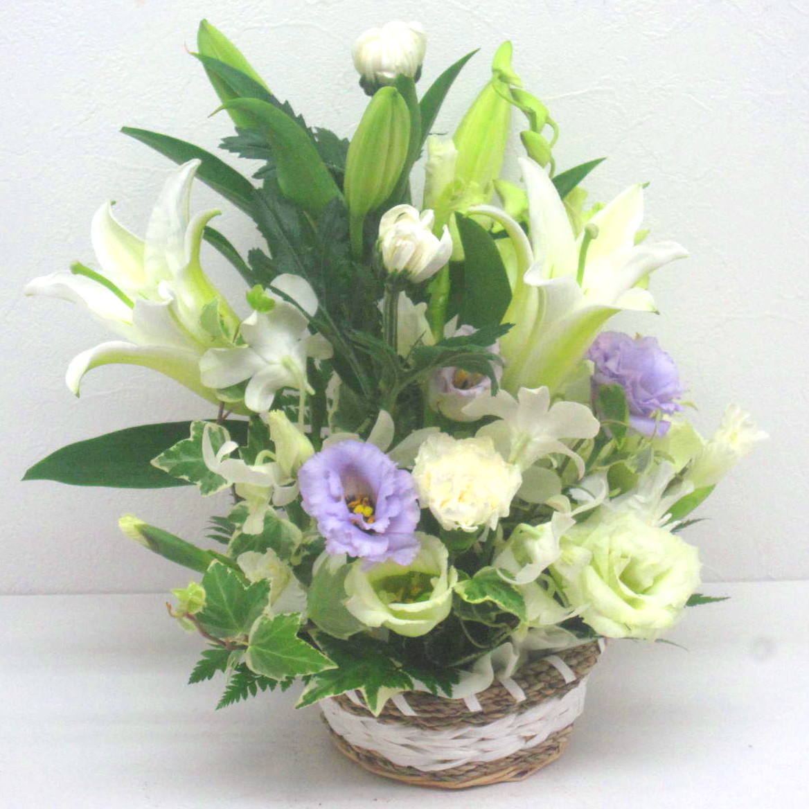 ユリとキクをメインにして淡いパープル色を入れた上品なアレンジメント。※こちらの商品についてのご相談、ご質問等ございましたら(メール)または(お電話)にて承ります。