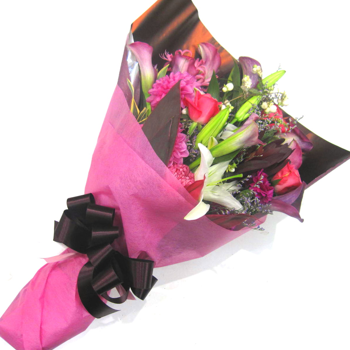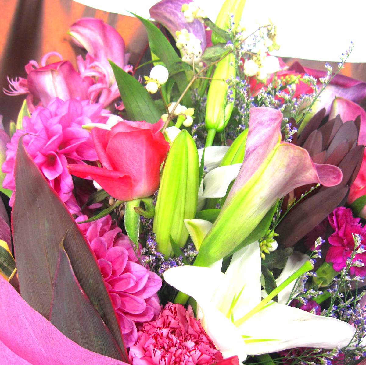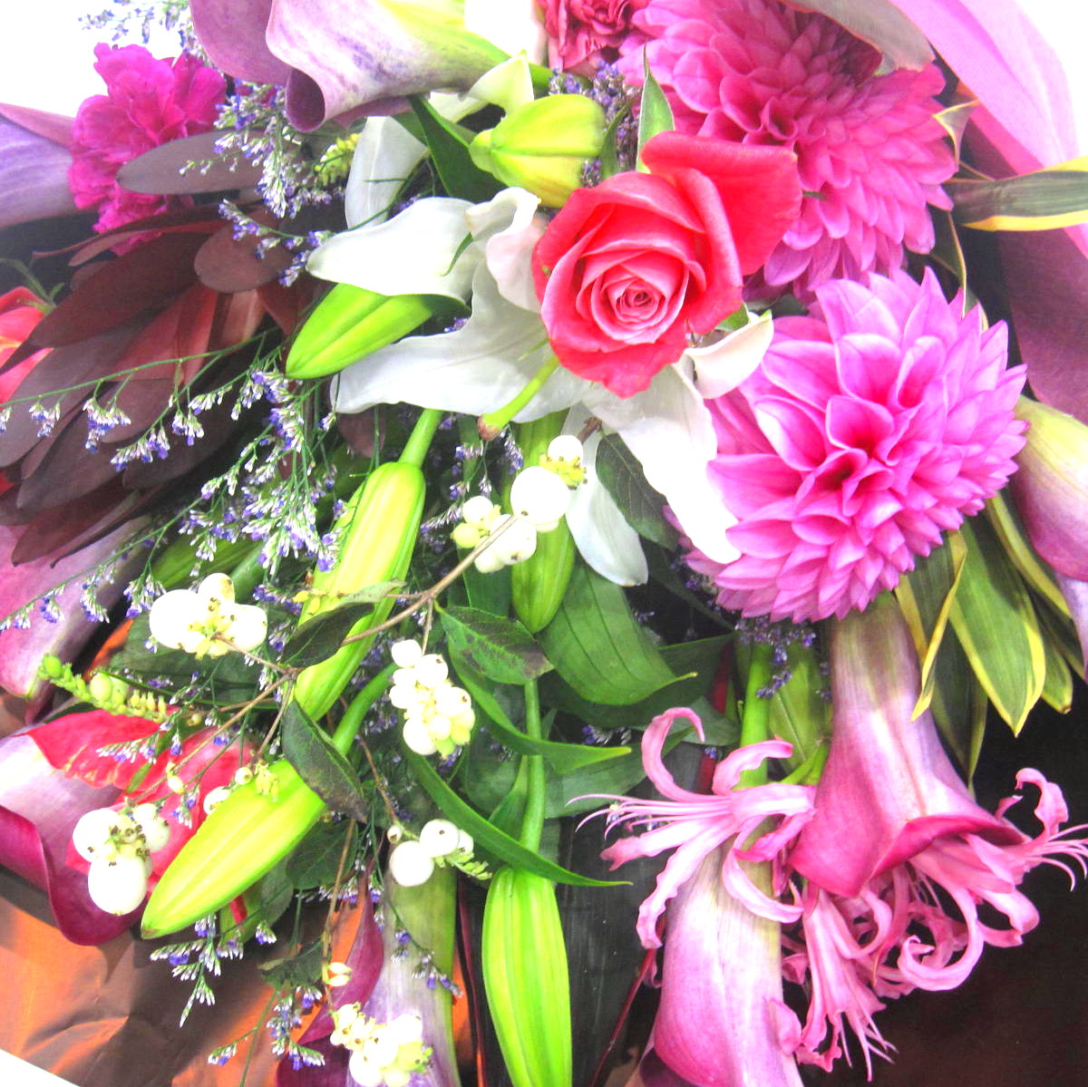 存在感のあるユリやダリア、バラを中心にまとめた華やかな花束です。秋色の色合いで落ち着きのあるラッピングも素敵ですよ。両手に抱えるくらいのビックサイズです。また、持ちの良いお花を中心に使っておりますので花持ちも良いでしょう。ご購入されたお客様から高い評価を頂いております。静岡県長泉町から日本全国【真心】込めてお届けいたします。さまざまなご用途に贈る贈り物としてオススメです。大切な方へ贈るフラワーギフトやプレゼントなら「花樹園オンラインドットコム」に是非、お任せ下さいませ。