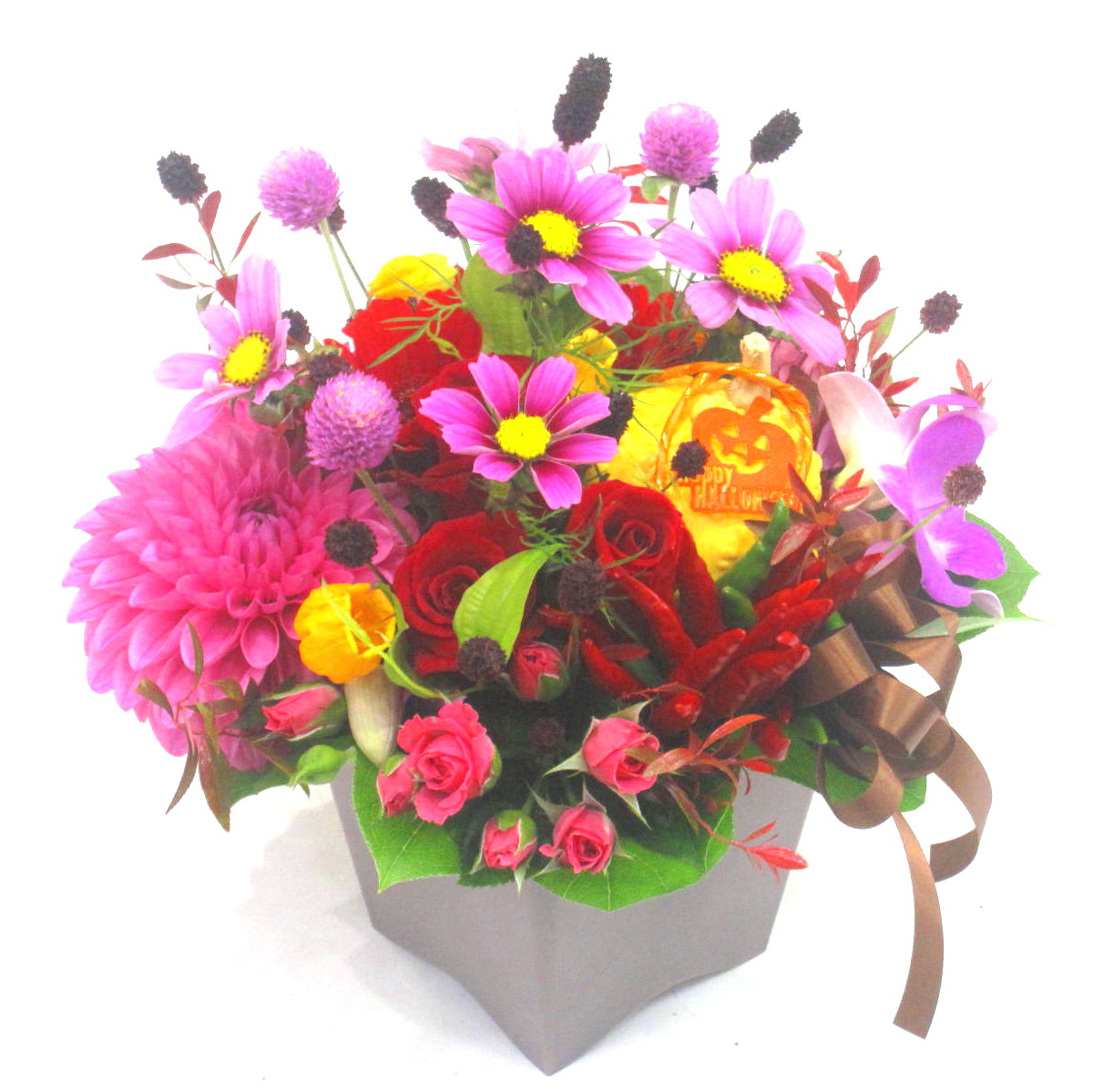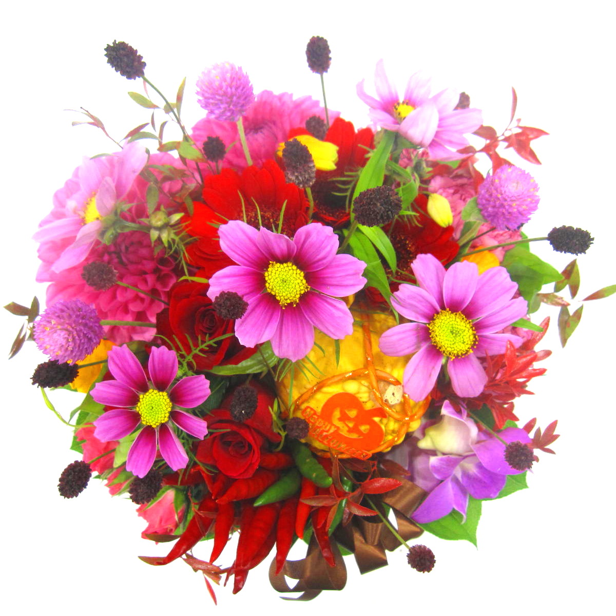落ち着きのある秋のお花が大切な日を華やかに演出します。コスモス、ワレモコウなどの秋の七草を入れてカボチャを添えて・・・。ハロウィン風に上品に制作いたします。また、ご利用されたお客様から「大変花持ちが良い」と好評をいただいております。静岡県長泉町から日本全国【真心】込めてお届けいたします。さまざまなご用途に贈る贈り物としてオススメです。大切な方へ贈るフラワーギフトやプレゼントなら「花樹園オンラインドットコム」に是非、お任せ下さいませ。