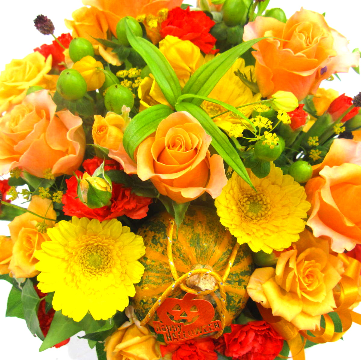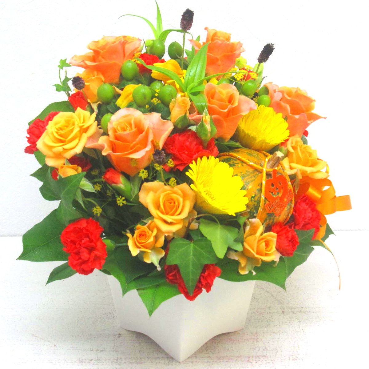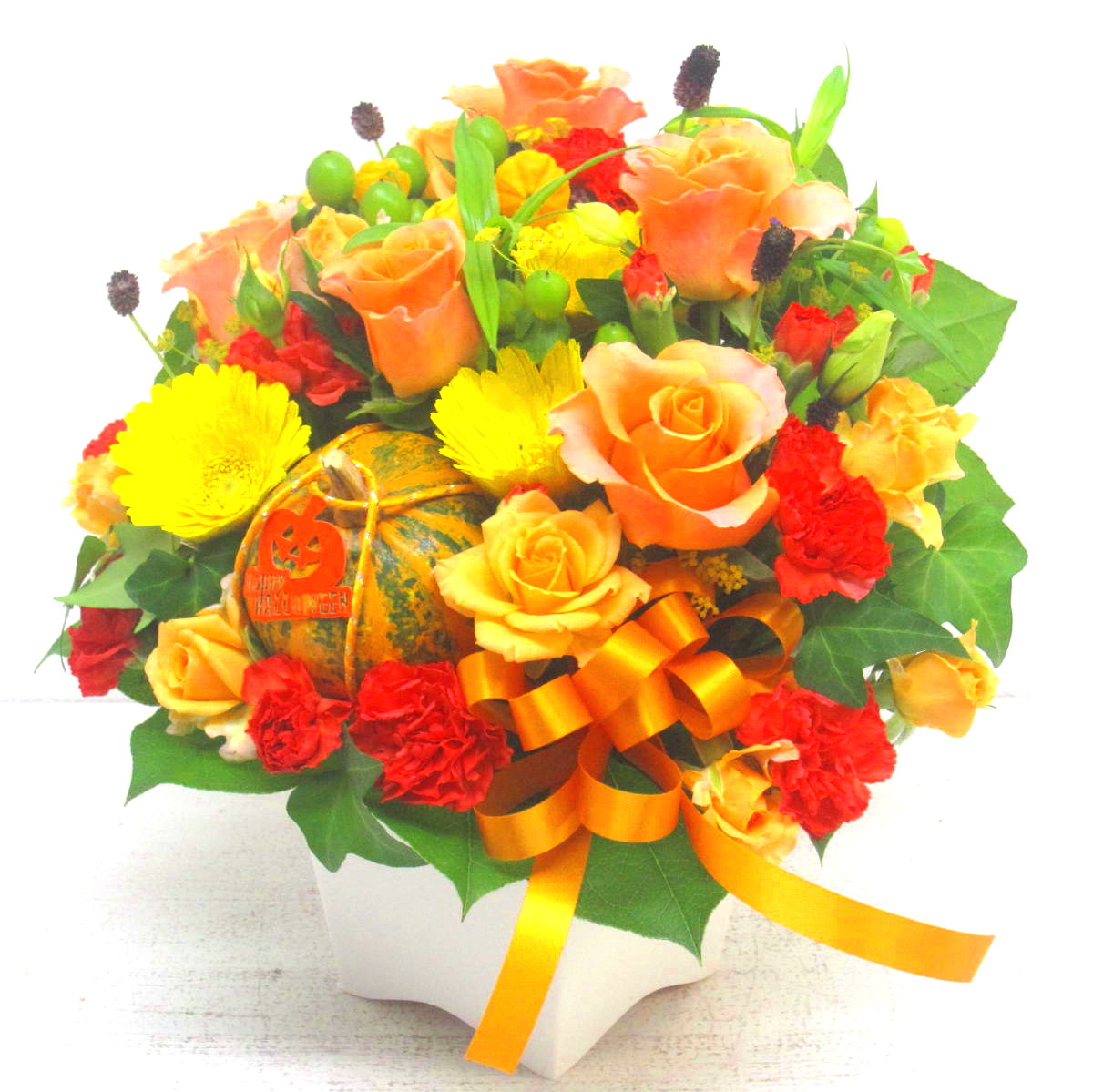 とっても明るいボリューム感のある秋色のお花が大切な日を華やかに演出します。ワレモコウなどの秋の七草を入れてカボチャを添えて・・・。ハロウィン風に上品に制作いたします。また、ご利用されたお客様から「大変花持ちが良い」と好評をいただいております。静岡県長泉町から日本全国【真心】込めてお届けいたします。さまざまなご用途に贈る贈り物としてオススメです。大切な方へ贈るフラワーギフトやプレゼントなら「花樹園オンラインドットコム」に是非、お任せ下さいませ。
