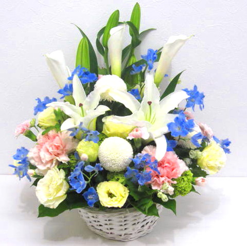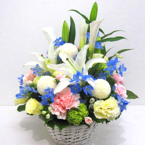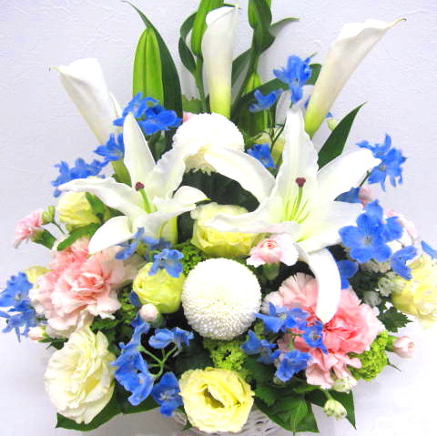 あの人を偲んで・・・淡い明るい色合いのアレンジメント。【15時迄のご注文で翌日届きます】※こちらの商品についてのご相談、ご質問等ございましたら(メール)または(お電話)にて承ります。