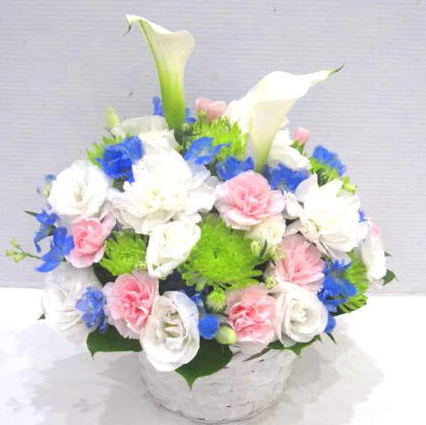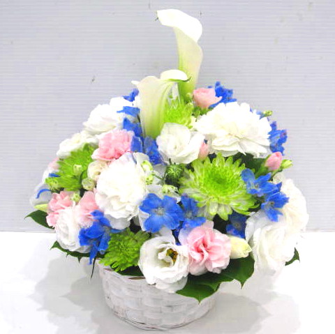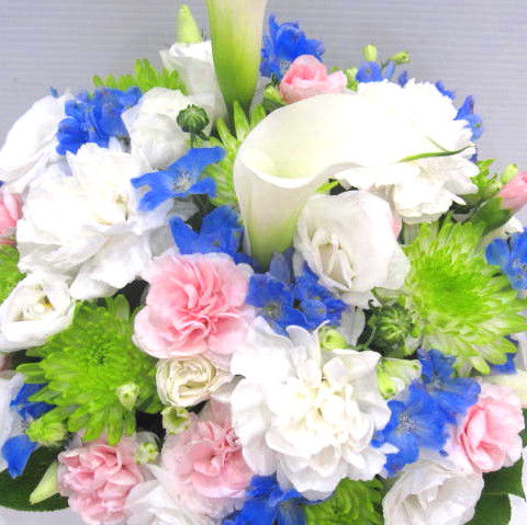 花材: メイン 菊、カーネーション、デルフィニュームなど その他 デルフィニューム、葉物類など
