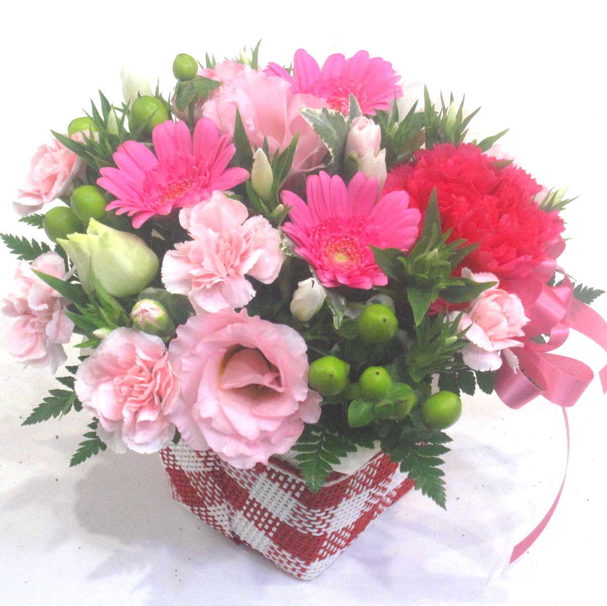 資材・ラッピング: スクエアバスケット、リボン、吸水性スポンジ、フラワーケアカード(取扱説明書) ※スクエアバスケットは、似たような色合いのバスケットに変わります。予めご了承ください。