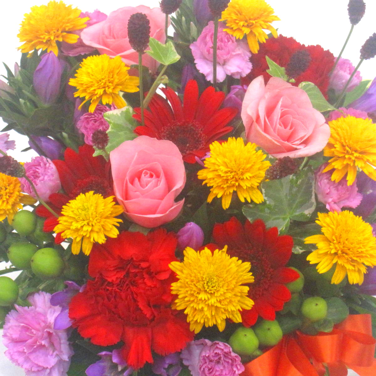 花材: メイン ワレモコウ、リンドウ、バラ、ガーベラ、カーネーション、秋の小花など その他 実物類、葉物類など