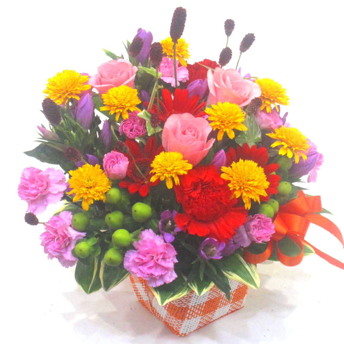 資材・ラッピング: スクエアバスケット、吸水性スポンジ、リボン、フラワーケアカード(取扱説明書) ※スクエアバスケットは、似たような色合いのバスケットに変わります。予めご了承ください。