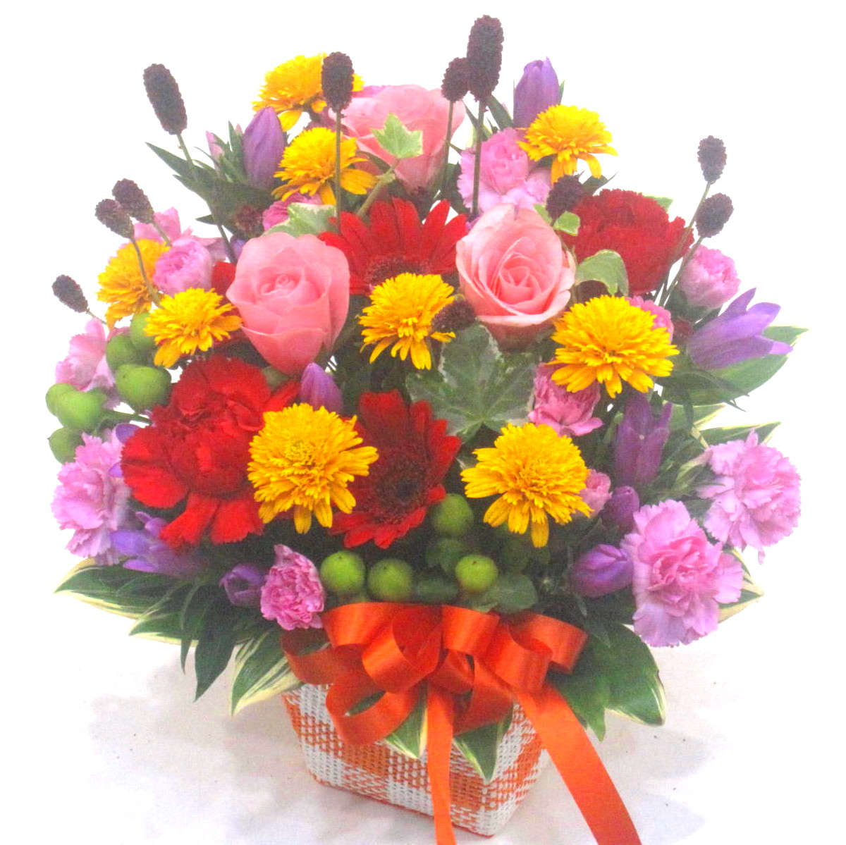 まるでバスケットから飛び出してきたかのような落ち着きのある明るい色合いの秋のアレンジメントです。ワレモコウやリンドウの秋しかないお花とあわせてボリュームよくお作りします。また、ご利用されたお客様から「大変花持ちが良い」と好評をいただいております。静岡県長泉町から日本全国【真心】込めてお届けいたします。さまざまなご用途に贈る贈り物としてオススメです。大切な方へ贈るフラワーギフトやプレゼントなら「花樹園オンラインドットコム」に是非、お任せ下さいませ。