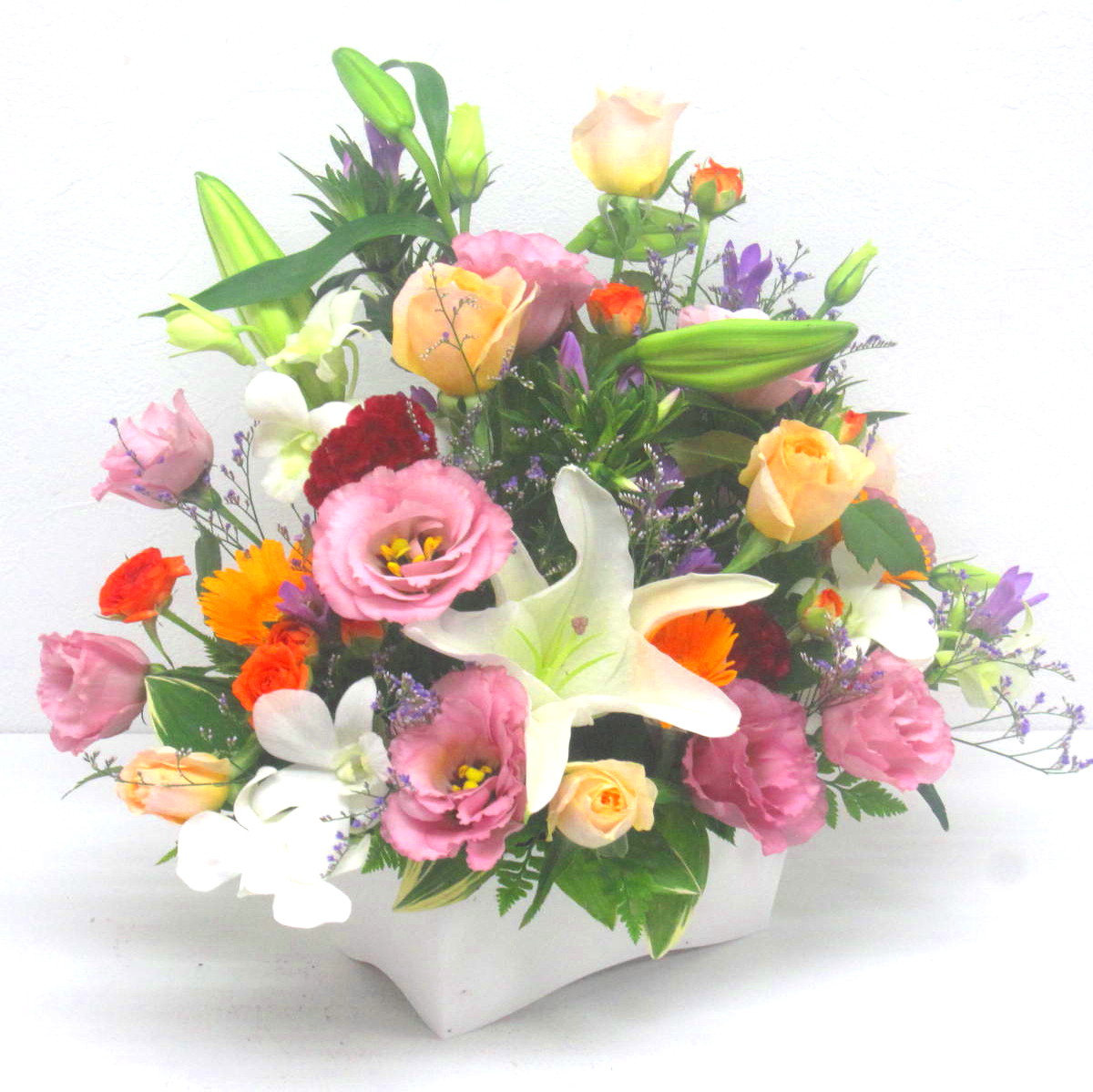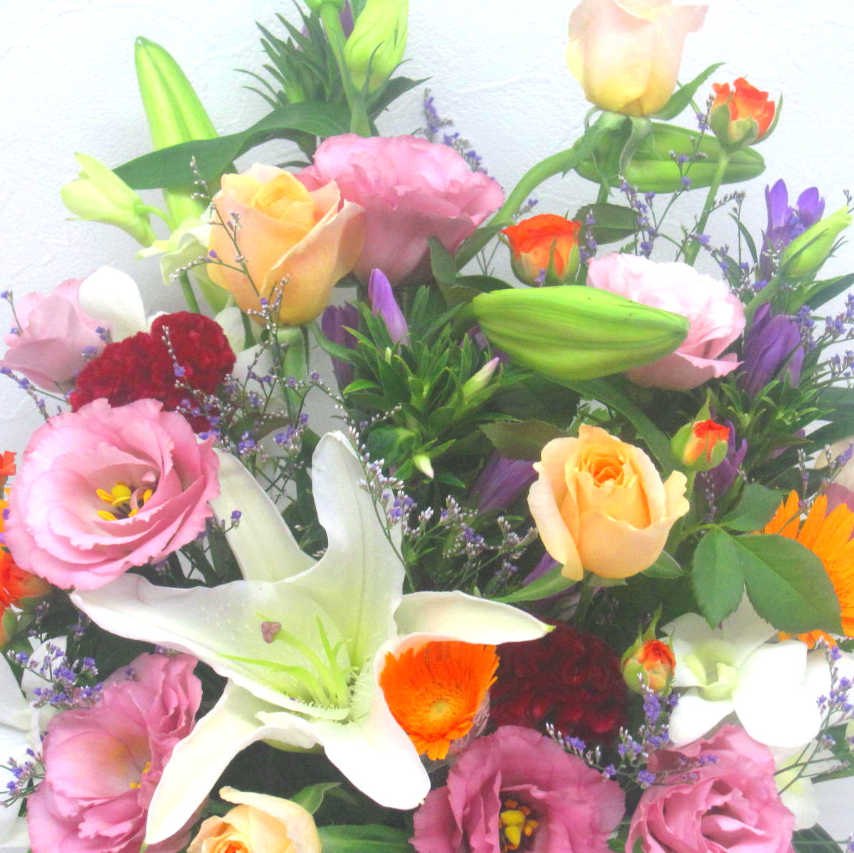 花材: メイン ユリ、バラ、ガーベラ、トルコギキョウ、リンドウなど その他 葉物類など
