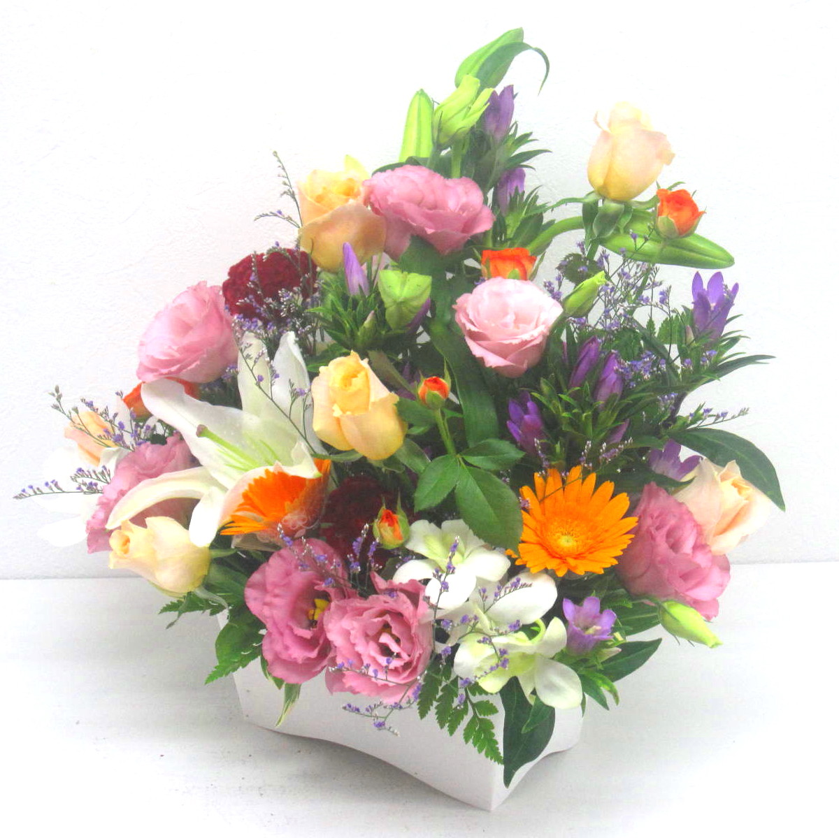 秋のお花「リンドウ」を入れてユリやバラなどと合わせた上品なアレンジメント。上品な雰囲気の方への贈り物にオススメですよ。【15時迄のご注文で翌日届きます】※こちらの商品についてのご相談、ご質問等ございましたら(メール)または(お電話)にて承ります。