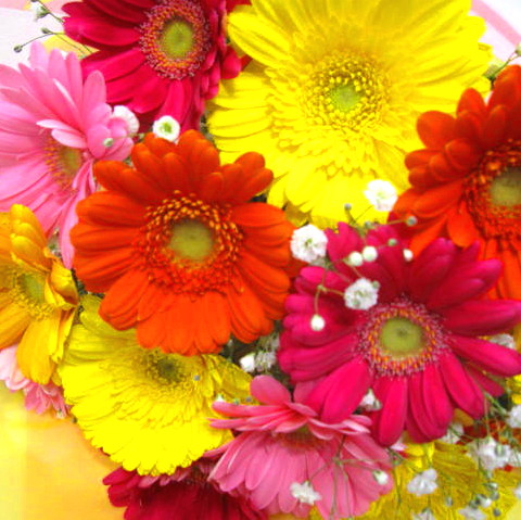 ガーベラが大好きなあの人へ…、ガーベラみたいに可愛らしいあの人へ…。ガーベラ5色MIXとかすみ草を入れた花束です。また、その日入荷したガーベラを使っておりますので花持ちも良いでしょう。ご購入されたお客様から高い評価を頂いております。きっととびっきりに喜んでいたただけると思いますよ。静岡県長泉町から日本全国【真心】込めてお届けいたします。さまざまなご用途に贈る贈り物としてオススメです。大切な方へ贈るフラワーギフトやプレゼントなら「花樹園オンラインドットコム」に是非、お任せ下さいませ。
