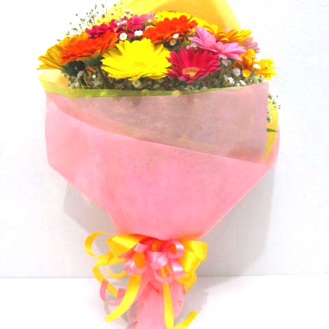 大人気の可愛くて明るいガーベラ中心の花束。ガーベラの花言葉は「希望」や「常に前進」という前向きな意味を持っています。希望本数等がございましたらお気軽にお問い合わせ下さい。(画像のガーベラの本数は、15本です。)