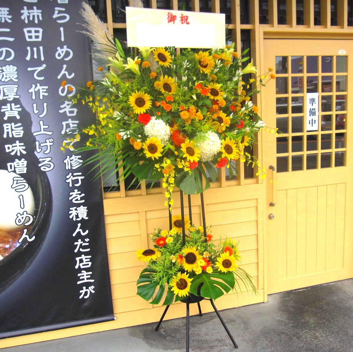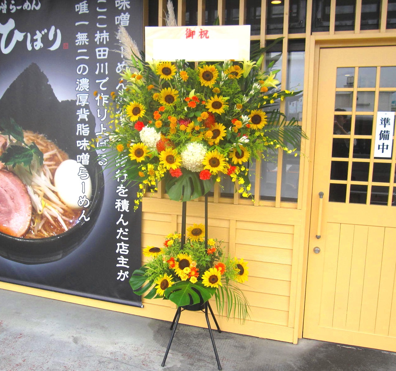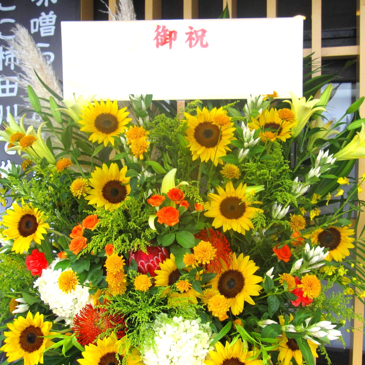 華やかな黄色&オレンジ系の迫力満点御祝いスタンド花2段になります。開店祝・発表会・個展・イベントなどパッと目を惹く花のオブジェそれぞれのシーンに合わせてお作り致します。どんな場所にもシンプルに飾れて、それぞれのシーンを華やかに彩ります。また、ご利用されたお客様から「大変花持ちが良い」と好評をいただいております。静岡県長泉町から日本全国【真心】込めてお届けいたします。さまざまなご用途に贈る贈り物としてオススメです。大切な方へ贈るフラワーギフトやプレゼントなら「花樹園オンラインドットコム」に是非、お任せ下さいませ。「当日配達可能地域」北海道・青森県・秋田県・岩手県・宮城県・山形県・福島県・茨城県・栃木県・群馬県・埼玉県・千葉県・東京都・神奈川県・山梨県・新潟県・長野県・富山県・石川県・福井県・岐阜県・静岡県・愛知県・三重県・滋賀県・京都府・大阪府・兵庫県・奈良県・和歌山県・鳥取県・島根県・岡山県・広島県・山口県・徳島県・香川県・愛媛県・高知県・福岡県・佐賀県・長崎県・熊本県・大分県・宮崎県・鹿児島県・沖縄県 ※イベントが無事終わりましたら、スタンドの台と立て札を無料で回収に伺います。ご安心下さい。