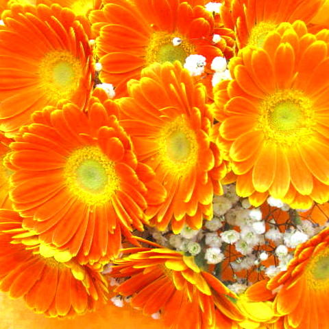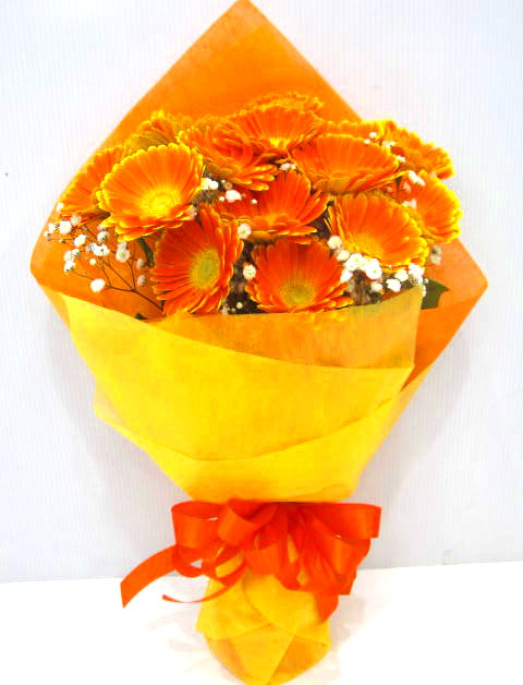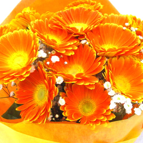 ガーベラが大好きなあの人へ…、ガーベラみたいに可愛らしいあの人へ…。オレンジガーベラとかすみ草を入れた花束です。きっととびっきりに喜んでいたただけると思いますよ。また、その日入荷したガーベラを使っておりますので花持ちも良いでしょう。ご購入されたお客様から高い評価を頂いております。静岡県長泉町から日本全国【真心】込めてお届けいたします。さまざまなご用途に贈る贈り物としてオススメです。大切な方へ贈るフラワーギフトやプレゼントなら「花樹園オンラインドットコム」に是非、お任せ下さいませ。