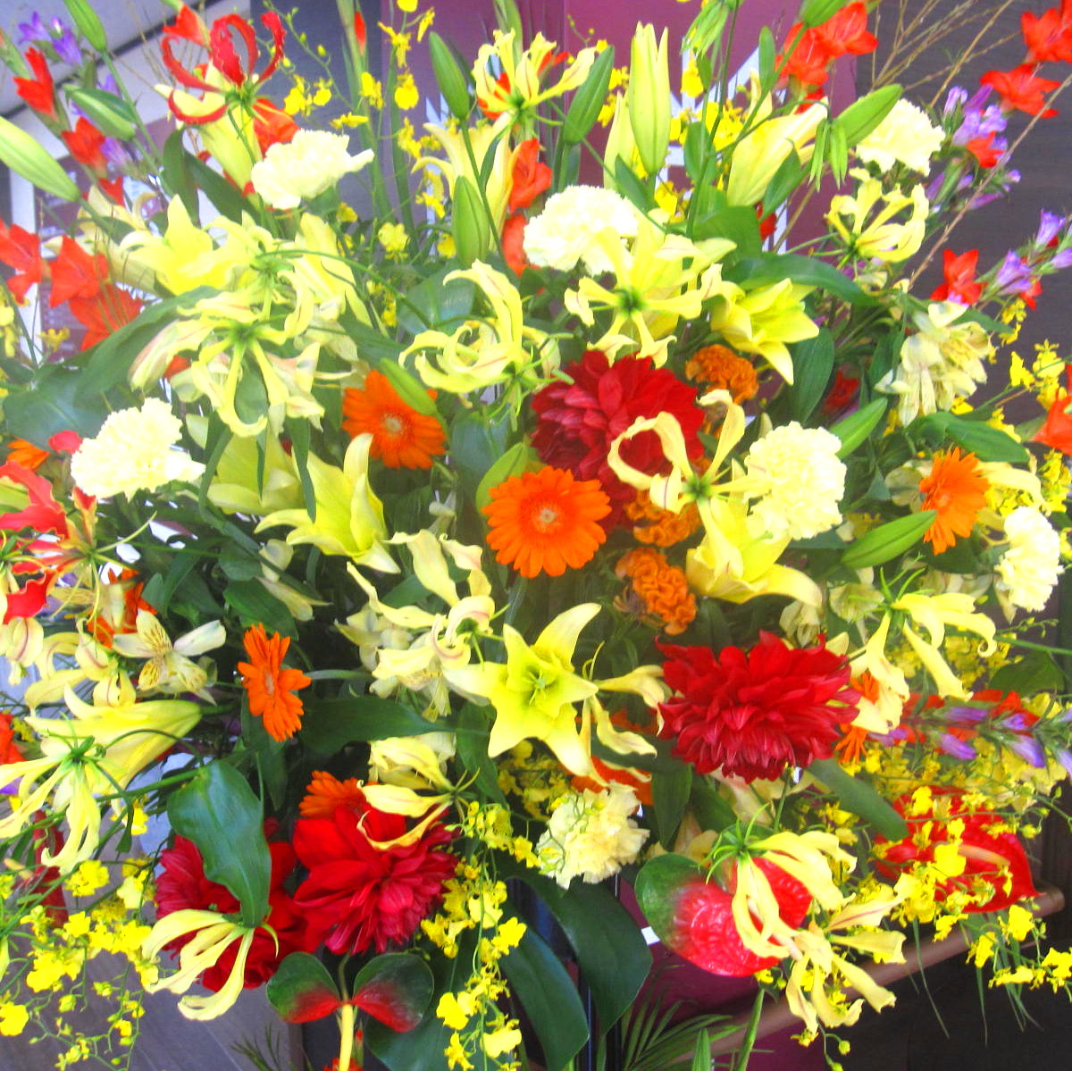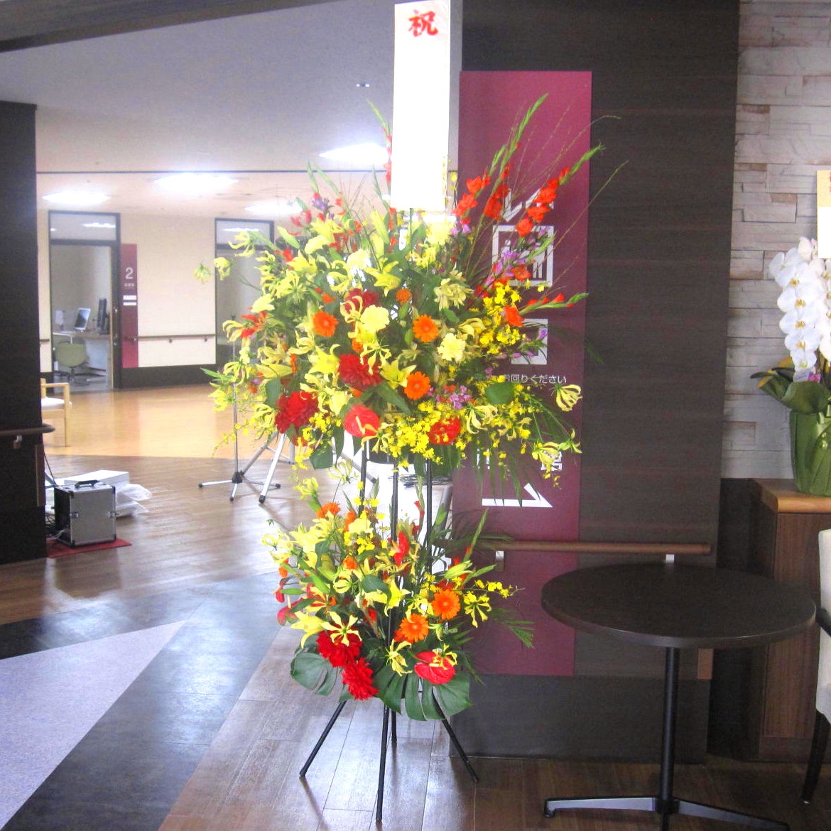 豪華絢爛の黄色&オレンジ系の迫力満点御祝いスタンド花2段になります。開店祝・発表会・個展・イベントなどパッと目を惹く花のオブジェそれぞれのシーンに合わせてお作り致します。どんな場所にもシンプルに飾れて、それぞれのシーンを華やかに彩ります。また、ご利用されたお客様から「大変花持ちが良い」と好評をいただいております。静岡県長泉町から日本全国【真心】込めてお届けいたします。さまざまなご用途に贈る贈り物としてオススメです。大切な方へ贈るフラワーギフトやプレゼントなら「花樹園オンラインドットコム」に是非、お任せ下さいませ。「当日配達可能地域」北海道・青森県・秋田県・岩手県・宮城県・山形県・福島県・茨城県・栃木県・群馬県・埼玉県・千葉県・東京都・神奈川県・山梨県・新潟県・長野県・富山県・石川県・福井県・岐阜県・静岡県・愛知県・三重県・滋賀県・京都府・大阪府・兵庫県・奈良県・和歌山県・鳥取県・島根県・岡山県・広島県・山口県・徳島県・香川県・愛媛県・高知県・福岡県・佐賀県・長崎県・熊本県・大分県・宮崎県・鹿児島県・沖縄県 ※イベントが無事終わりましたら、スタンドの台と立て札を無料で回収に伺います。ご安心下さい。
