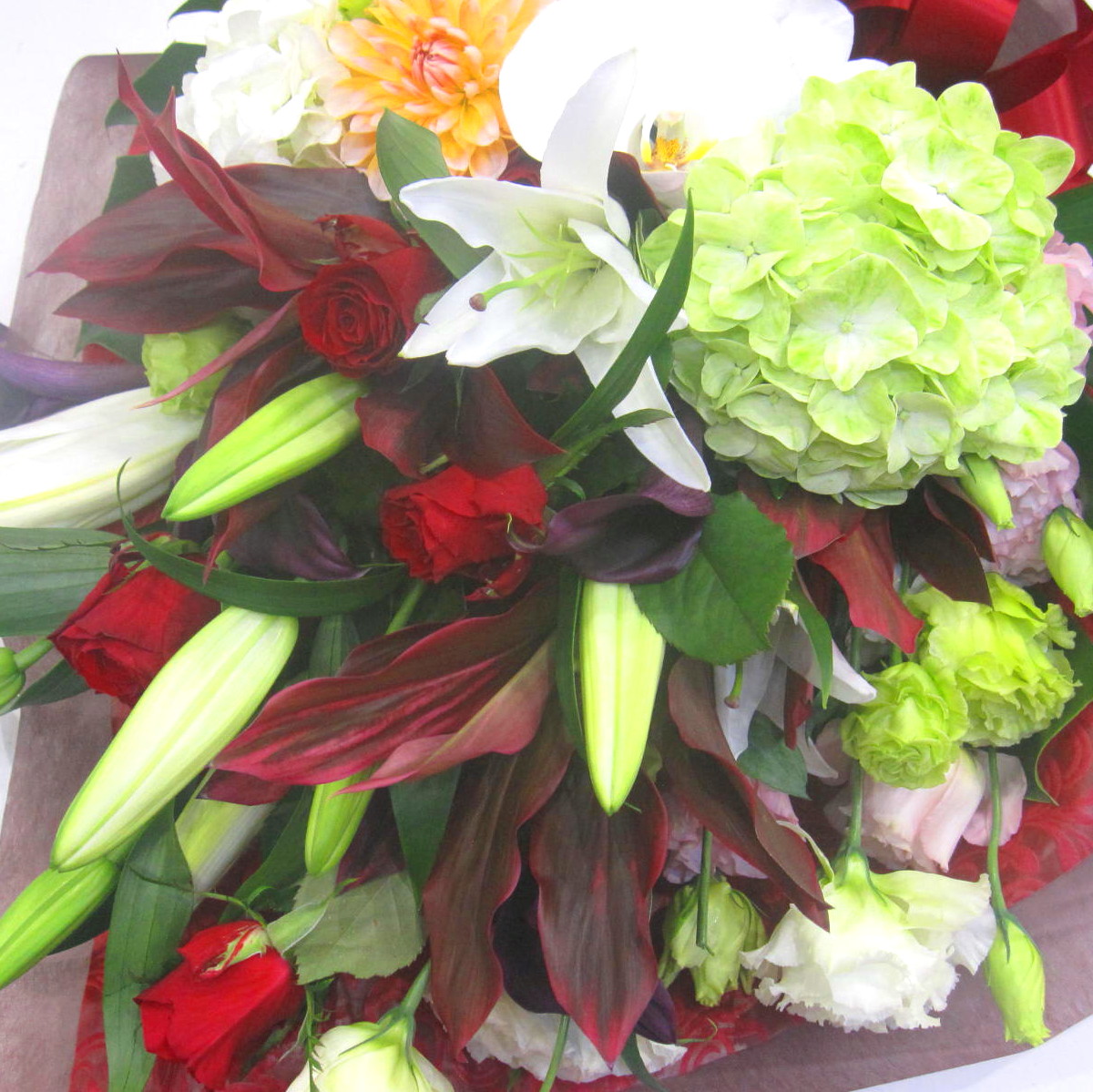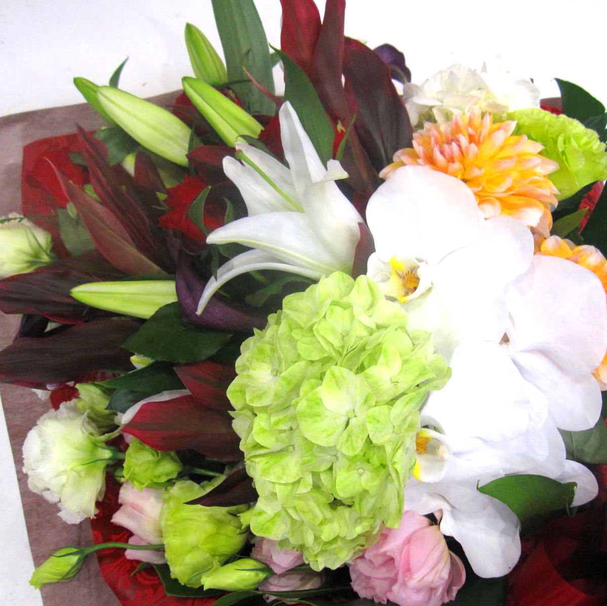 花材: メイン バラ、ユリ、コチョウラン、ダリア、トルコギキョウ、アジサイなど その他 ドラセナなど