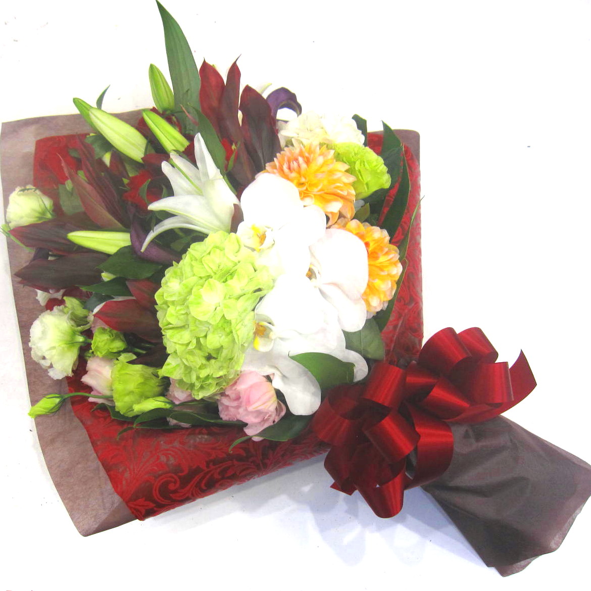 高級な雰囲気漂う花束です。ユリはとっても上品で貴賓さが漂い、バラは高級感溢れる最高級の赤いバラを使用。ダリアや、トルコギキョウなどちょっぴり目を惹く珍しいお花を入れて、コチョウランをアクセントに高級なイメージを漂わせます。かなりお花を貰いなれている人であれば必ず喜んでくれるアイテムですよ。また、ご利用されたお客様から「大変花持ちが良い」と好評をいただいております。静岡県長泉町から日本全国【真心】込めてお届けいたします。さまざまなご用途に贈る贈り物としてオススメです。大切な方へ贈るフラワーギフトやプレゼントなら「花樹園オンラインドットコム」に是非、お任せ下さいませ。