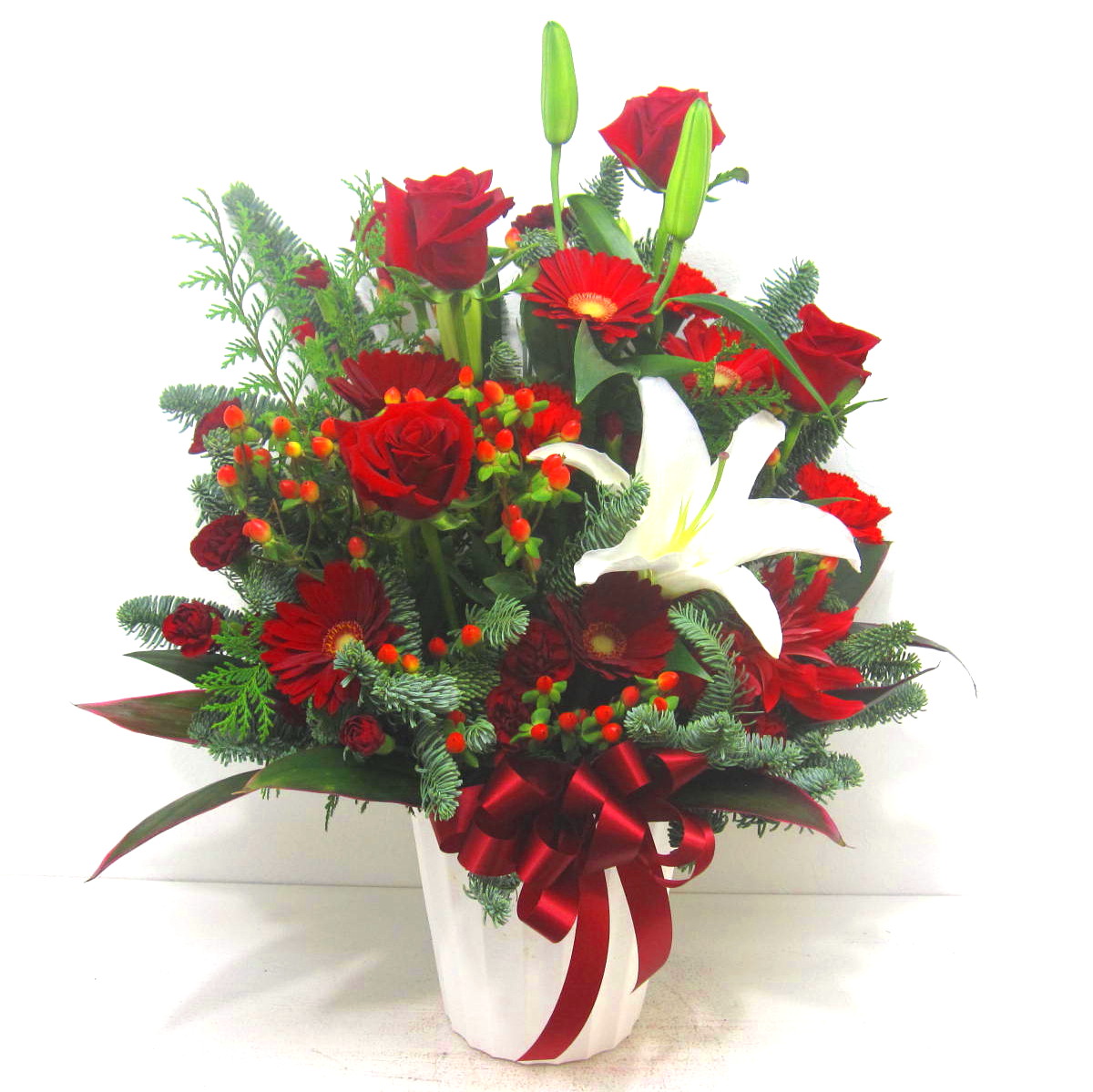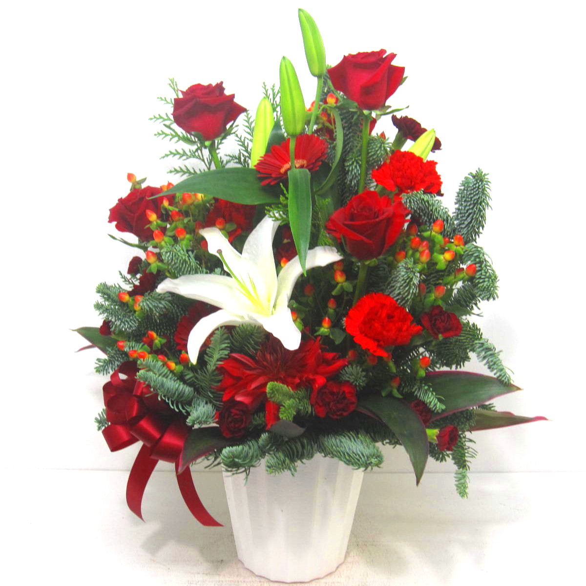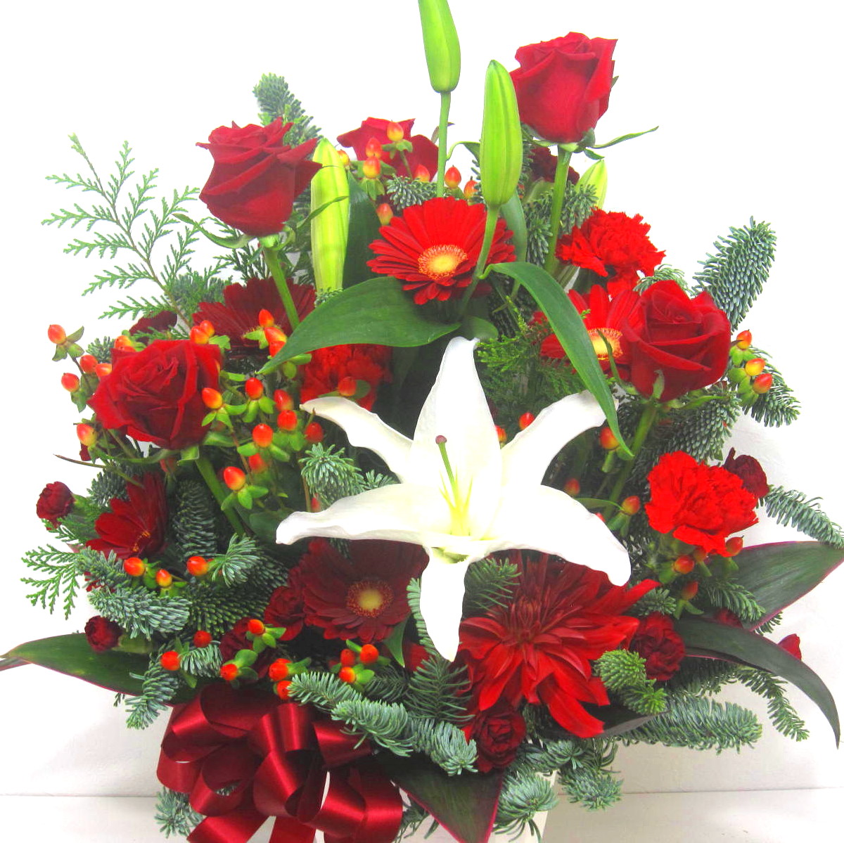 純白なユリと赤いバラやガーベラなどでまとめたアレンジメントです。クリスマスのこの時期にピッタリな色合いです。また、ご利用されたお客様から「大変花持ちが良い」と好評をいただいております。静岡県長泉町から日本全国【真心】込めてお届けいたします。さまざまなご用途に贈る贈り物としてオススメです。大切な方へ贈るフラワーギフトやプレゼントなら「花樹園オンラインドットコム」に是非、お任せ下さいませ。