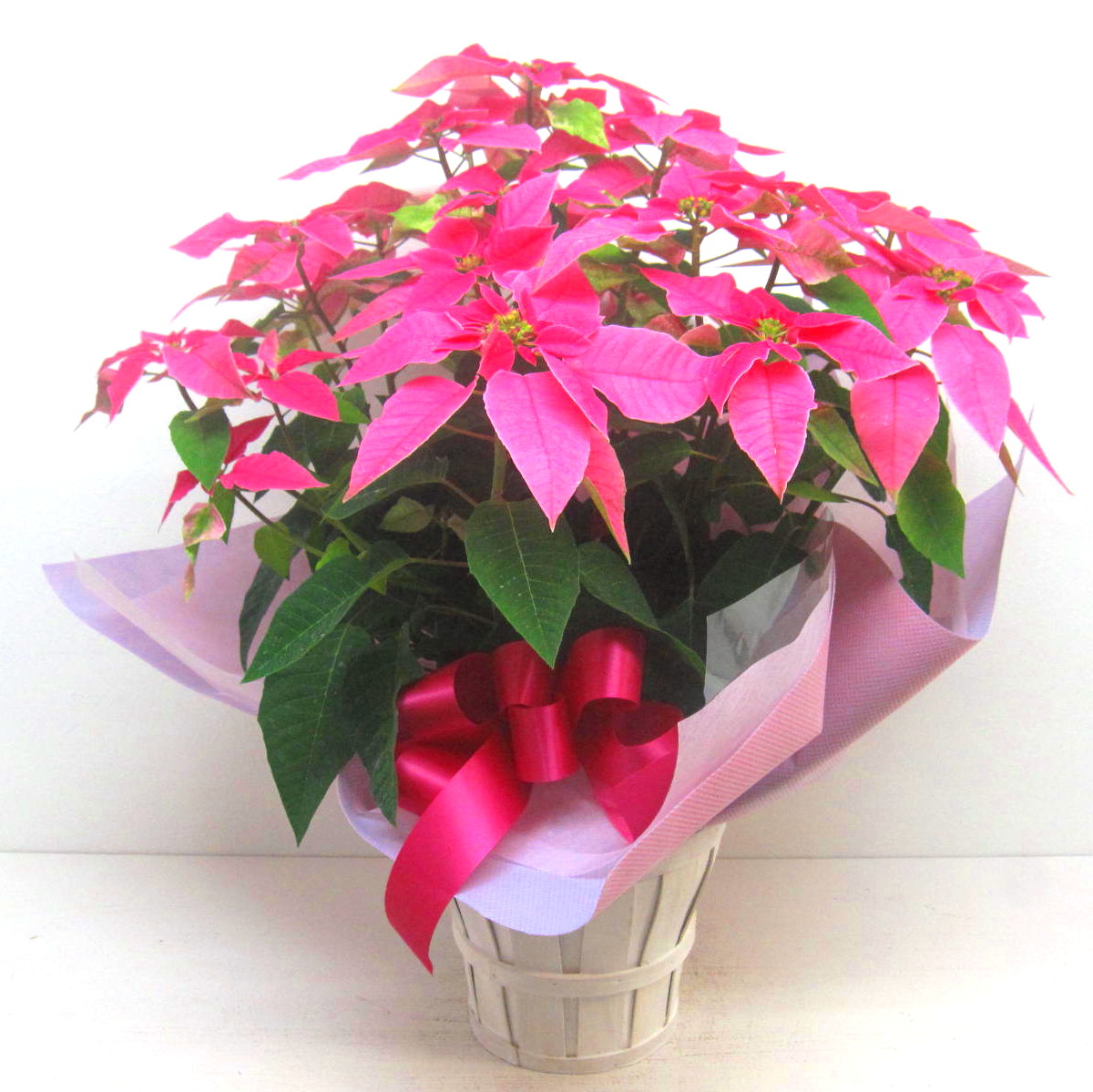 花材: メイン プリンセチア【ピンク(5号鉢)】 その他 バスケットに入れて綺麗にラッピング致します。