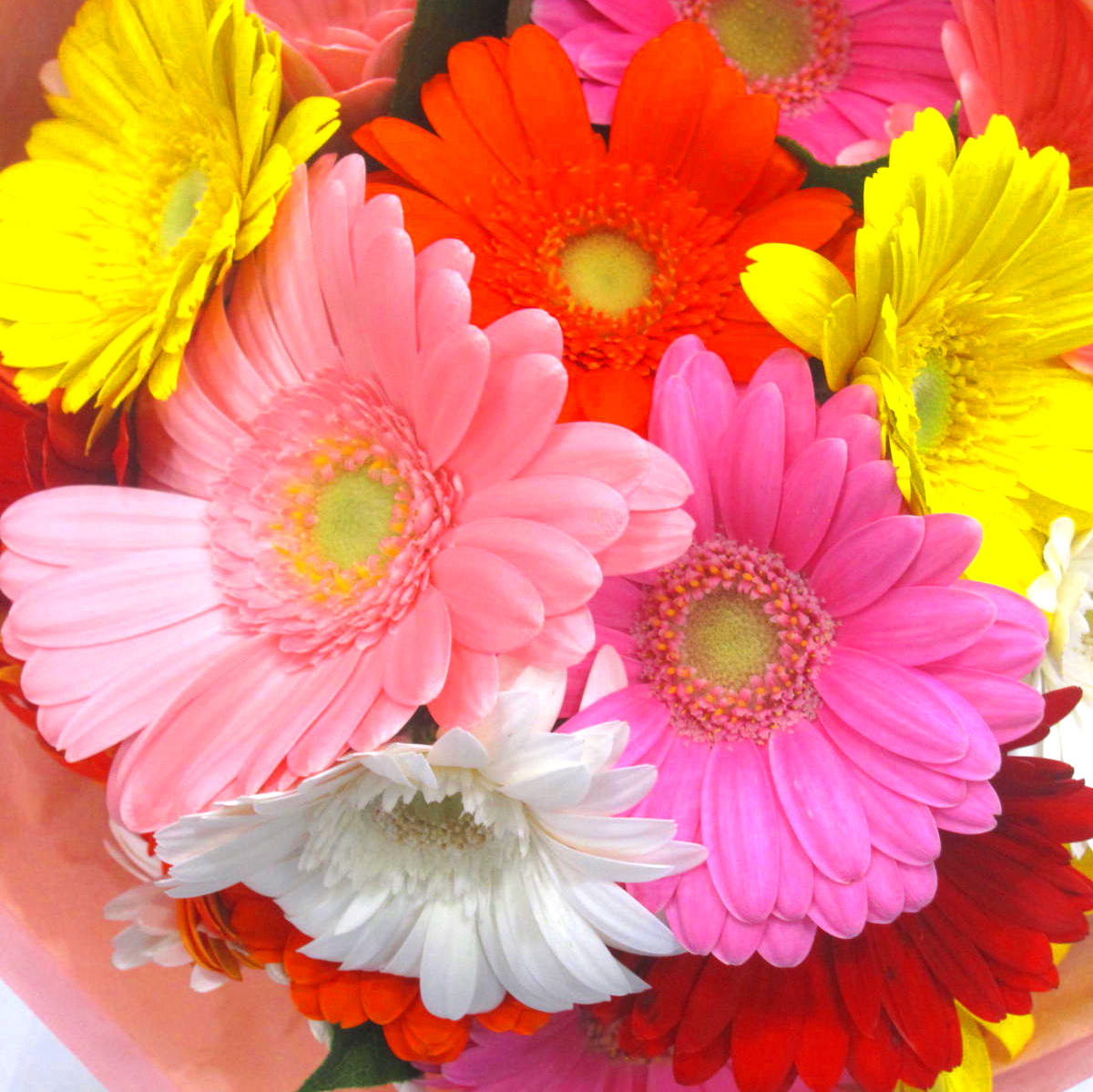 すっごく可愛い花束です。ガーベラが大好きなあの人へ…、ガーベラみたいに可愛らしいあの人へ…。ガーベラ5色MIXのブーケ風花束です。当店ではお客様の想い大切に【こころを込めて】お作りいたします。静岡県長泉町から手渡しお届けまたは宅急便で全国にお届けします。お誕生日や発表会などさまざまな贈り物に。。。