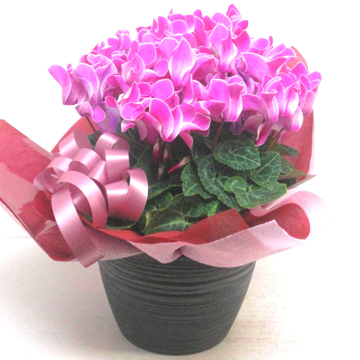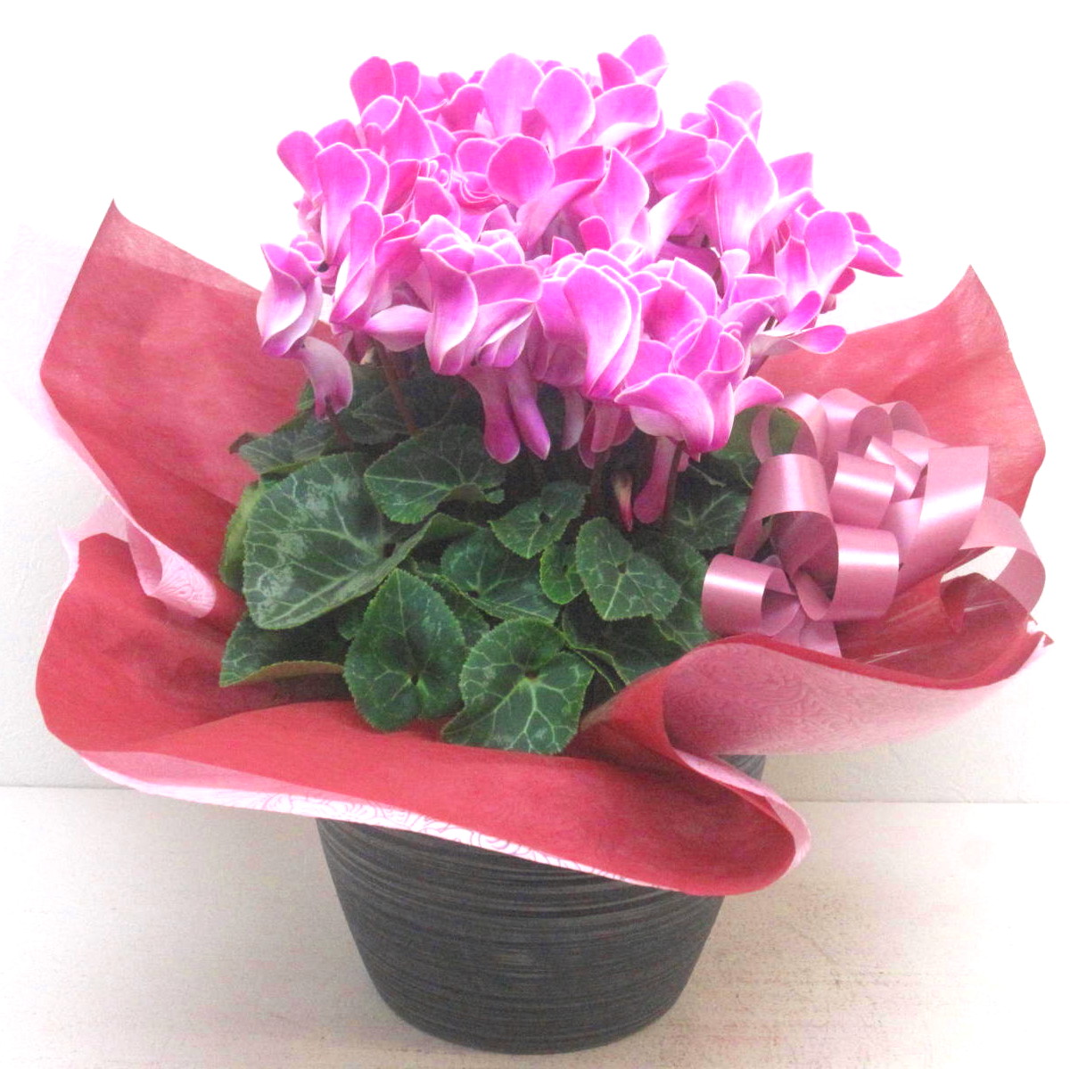 花材: メイン シクラメン【複色ピンク】(5号鉢) その他 コンポートを付けて画像のように綺麗に美しくラッピング致します。