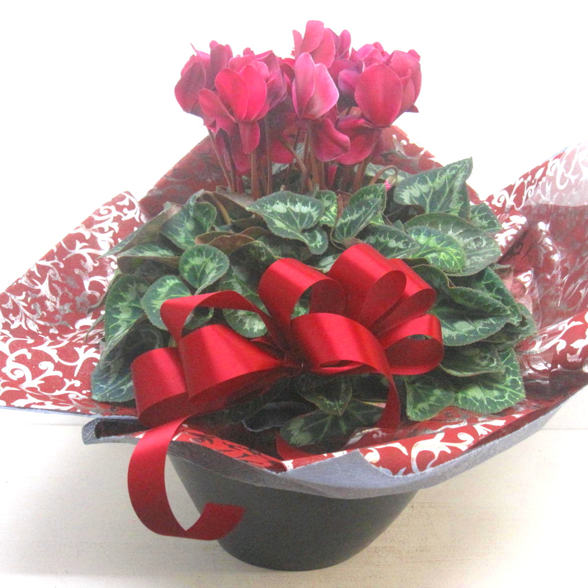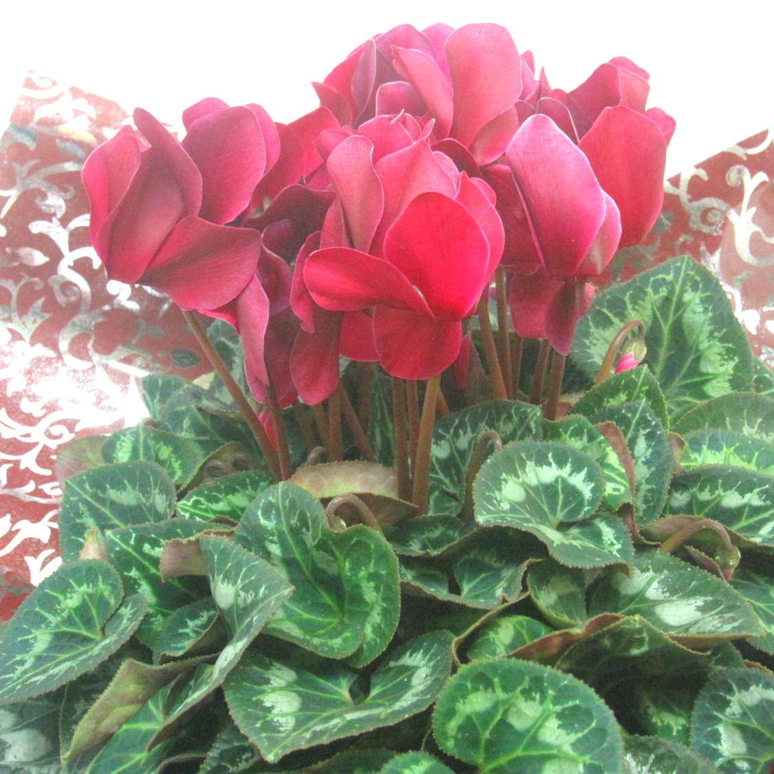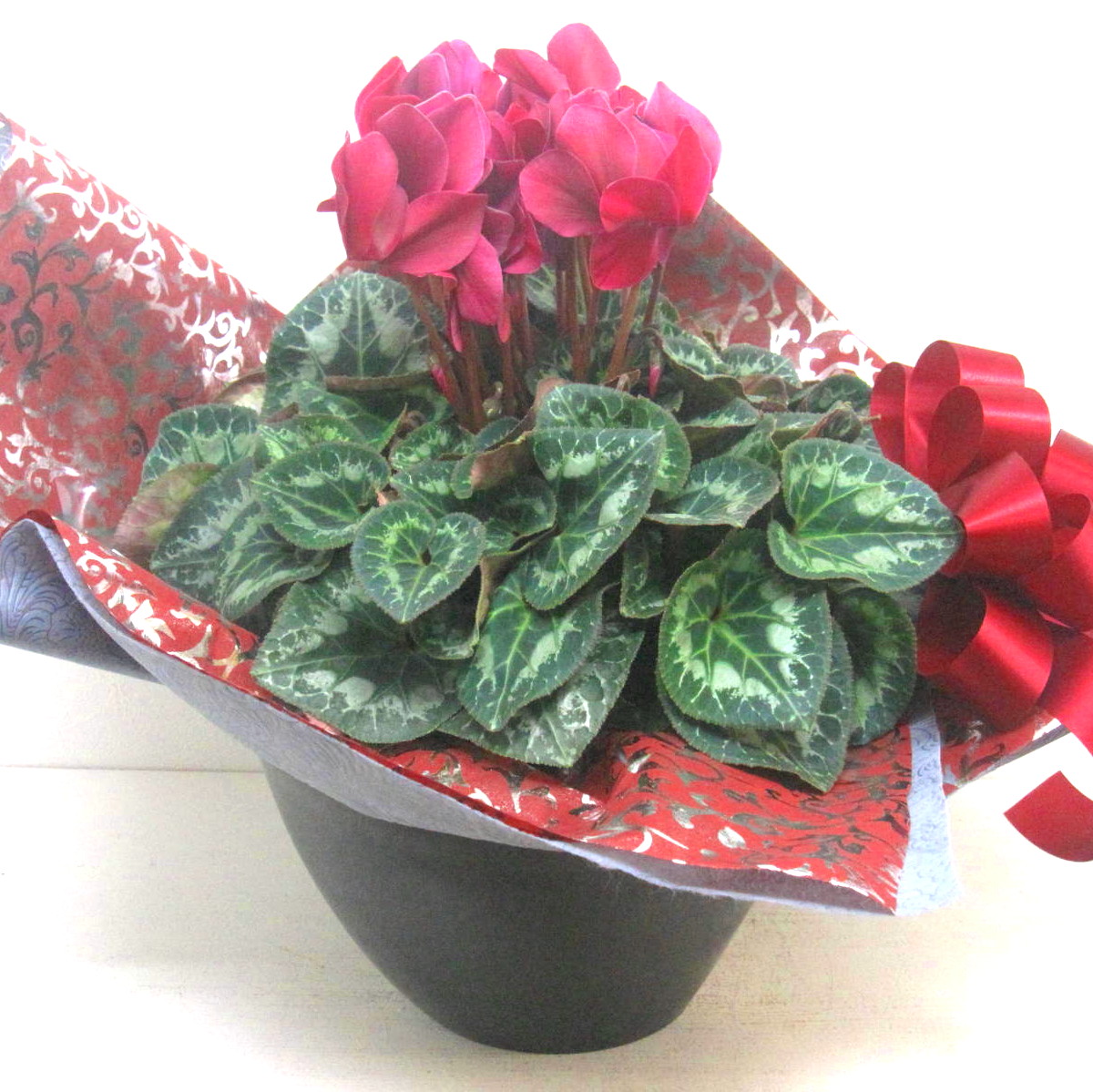 花材: メイン シクラメン【ワイン色】(6号鉢) その他 画像のように綺麗に美しくラッピング致します。