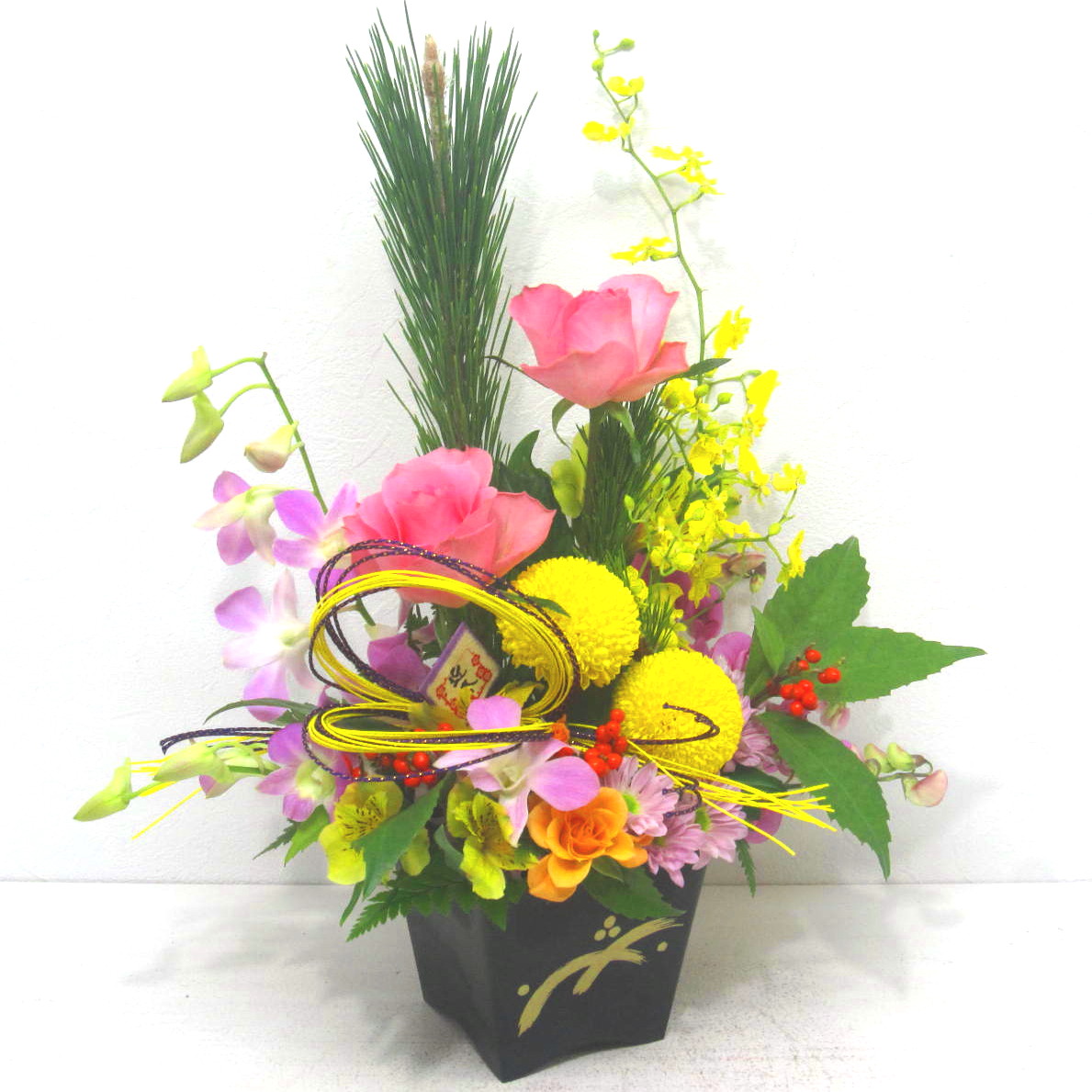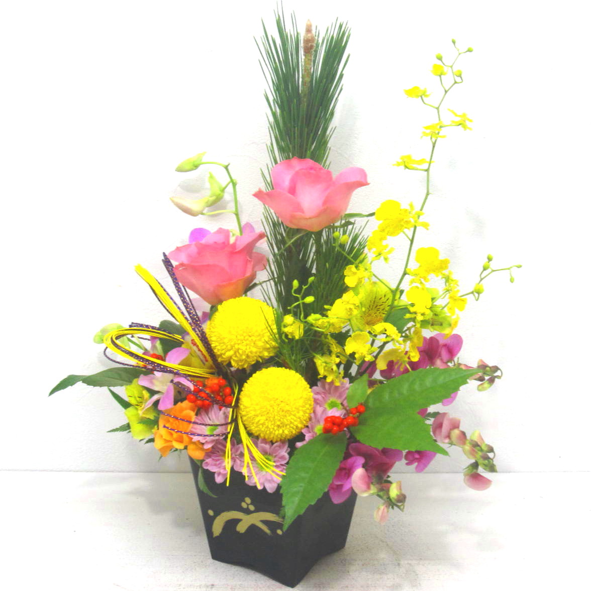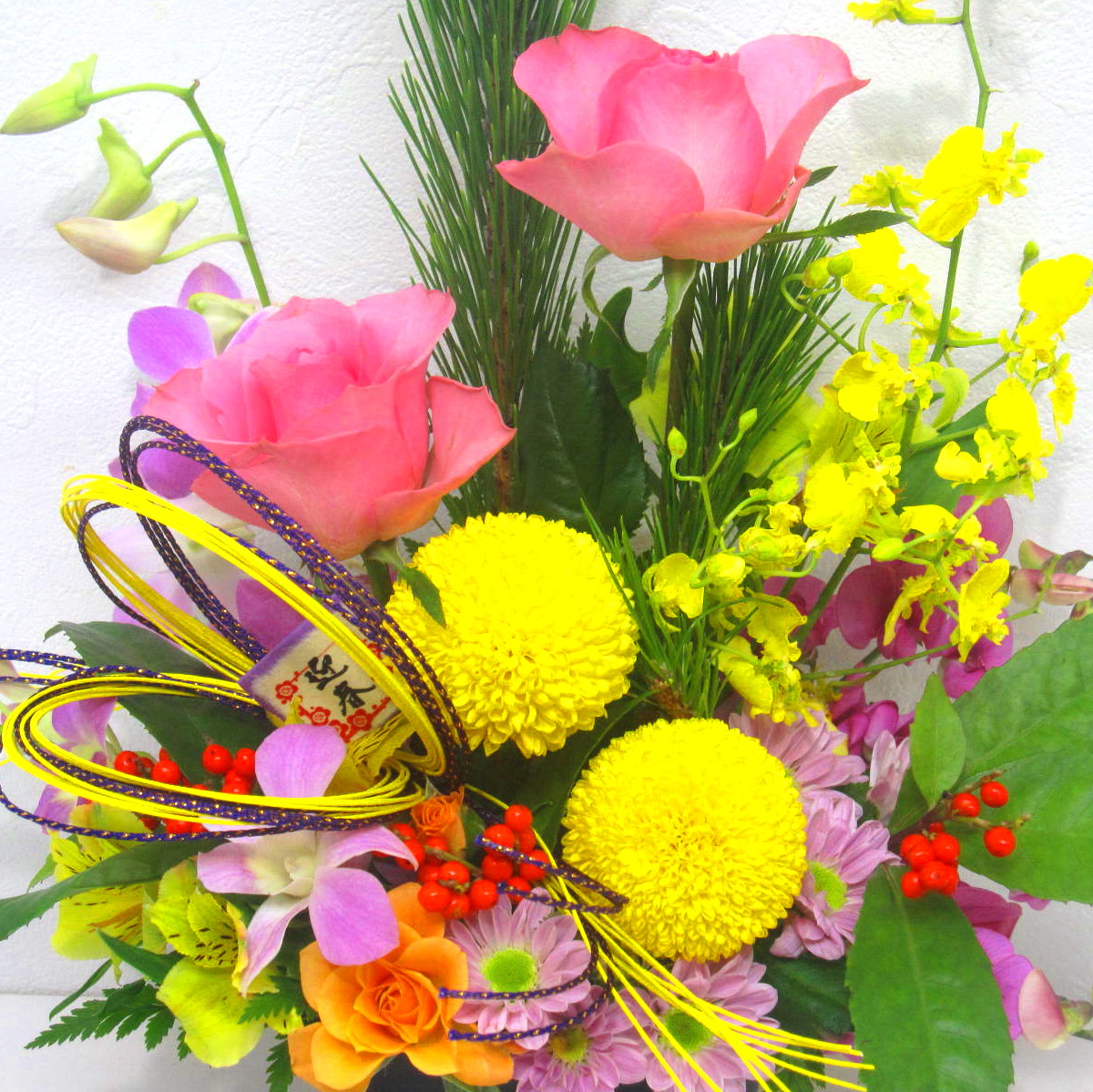 カラフルなお正月のアレンジメントです。お家の玄関にあるだけでも見栄えがしますし、貰った方もバラの良い香りにご満足することでしょう。また、ご利用されたお客様から「大変花持ちが良い」と好評をいただいております。静岡県長泉町から日本全国【真心】込めてお届けいたします。さまざまなご用途に贈る贈り物としてオススメです。大切な方へ贈るフラワーギフトやプレゼントなら「花樹園オンラインドットコム」に是非、お任せ下さいませ。