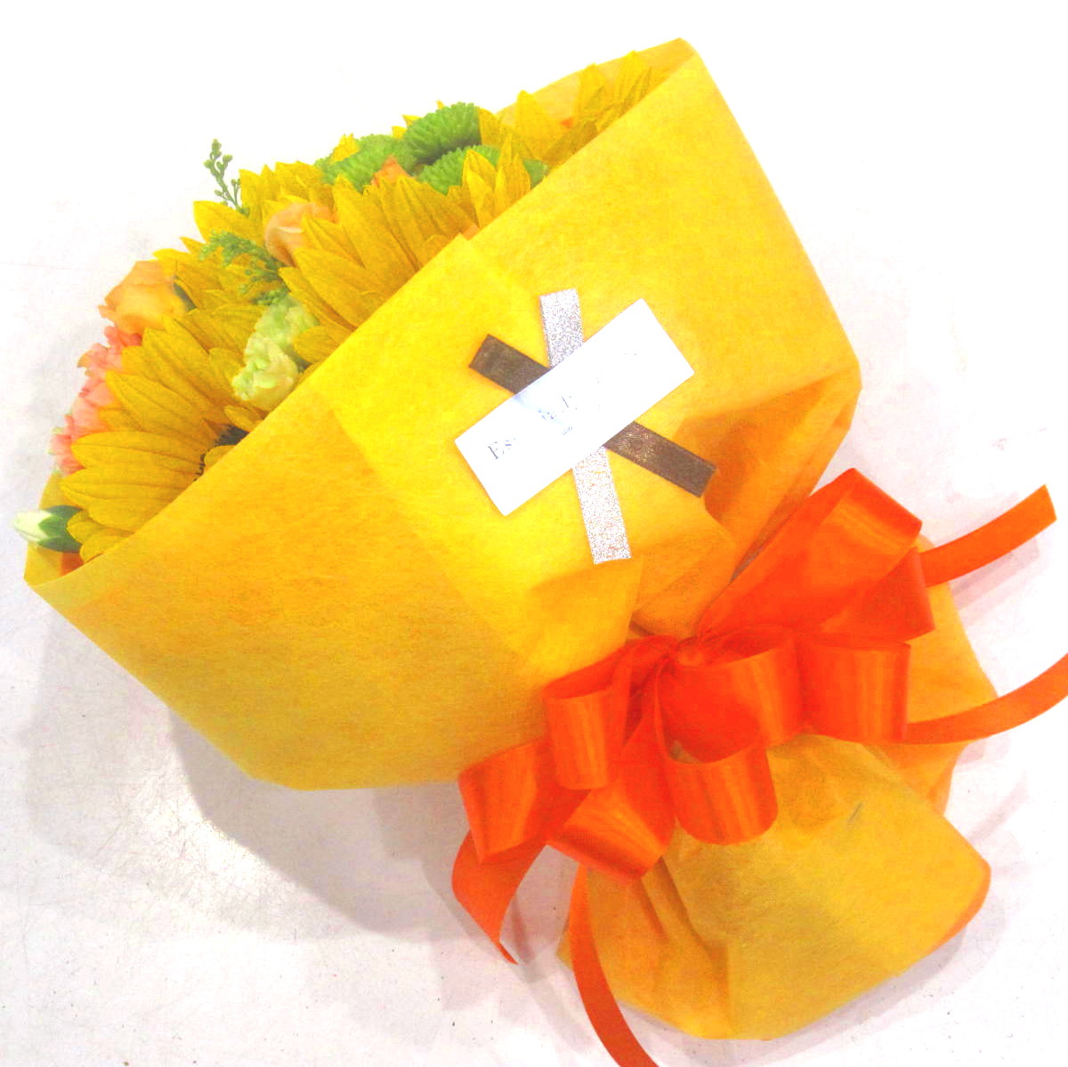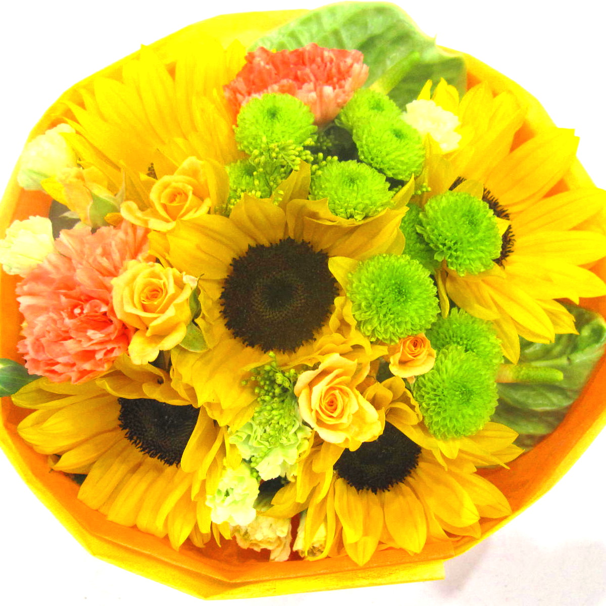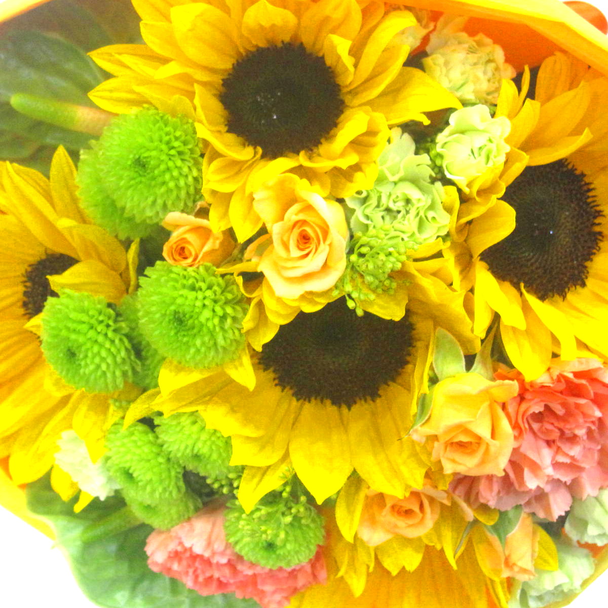 大人気のヒマワリを入れた可愛らしい花束。持ち運びもしやすくオススメです。【15時迄のご注文で翌日届きます】※こちらの商品についてのご相談、ご質問等ございましたら(メール)または(お電話)にて承ります。
