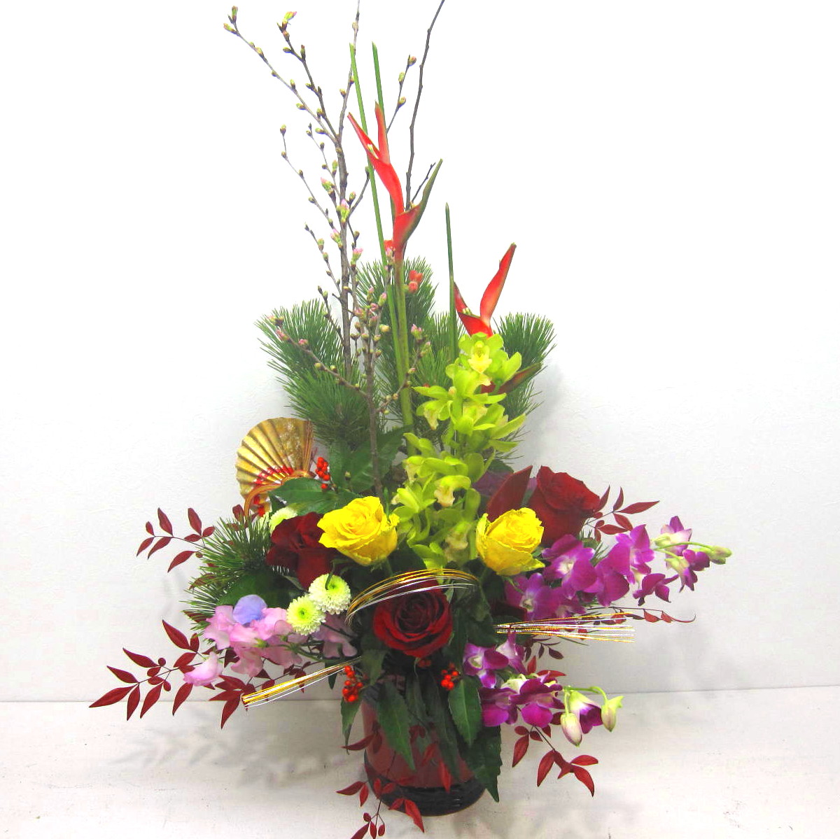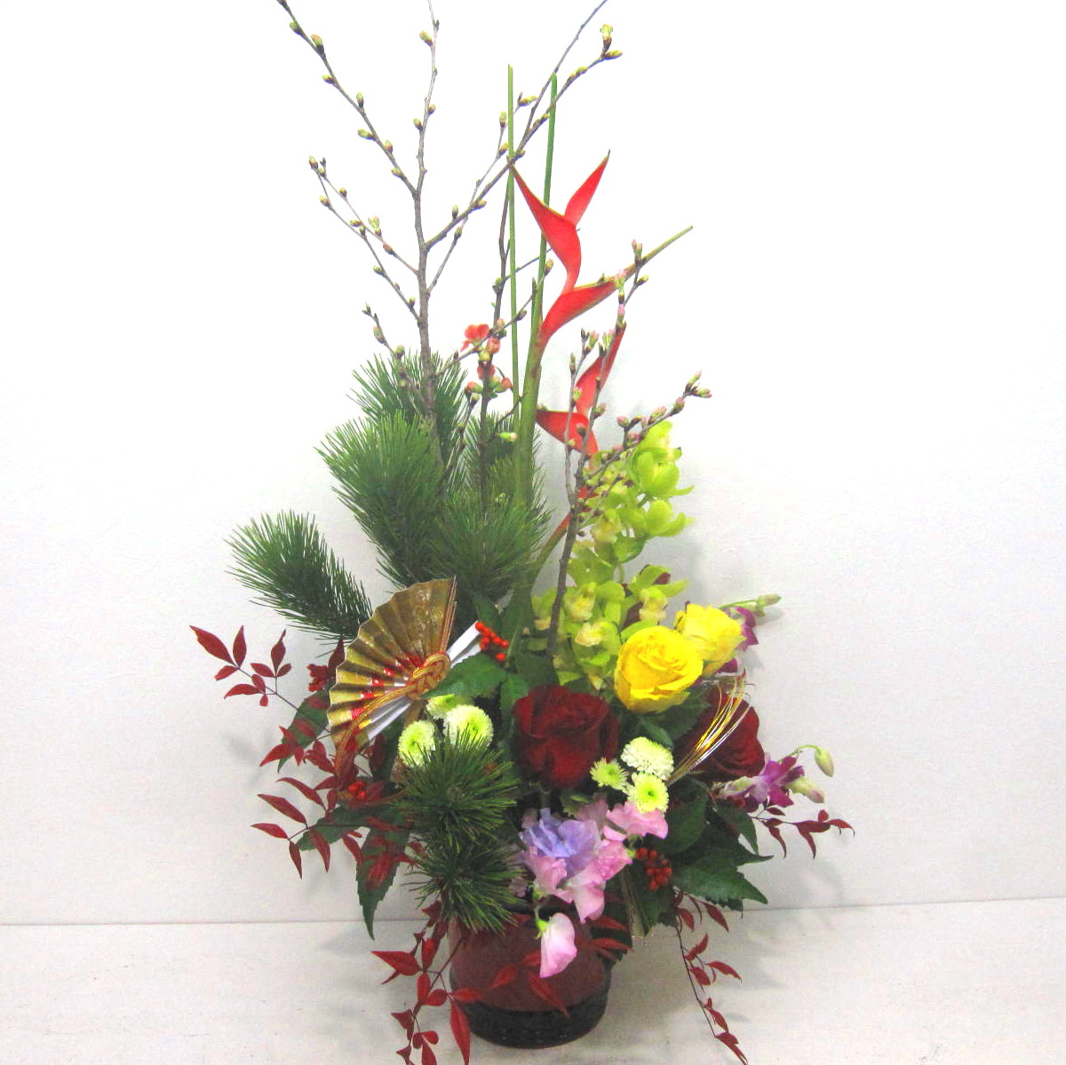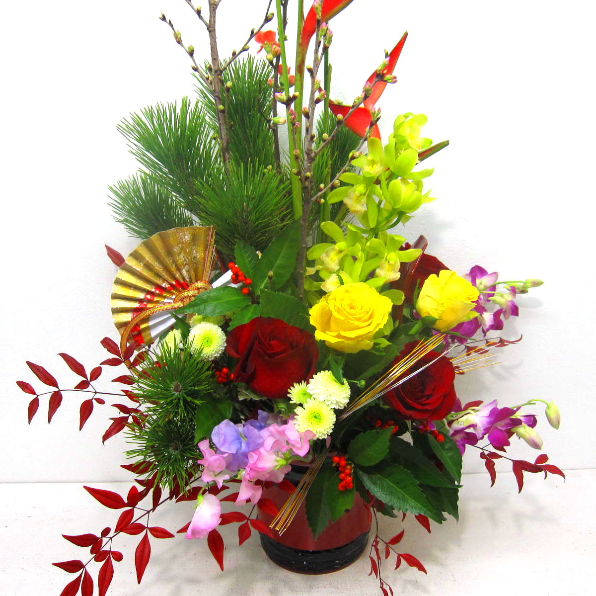 花材: メイン 松、千両、スイートピー、マム、バラ、デンファレなど その他 蘭系のお花、葉物類など