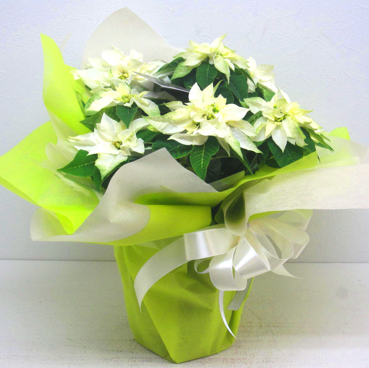 花材: メイン プリンセチア【ピュアホワイト(5号鉢)】 その他 画像のように綺麗に美しくラッピング致します。