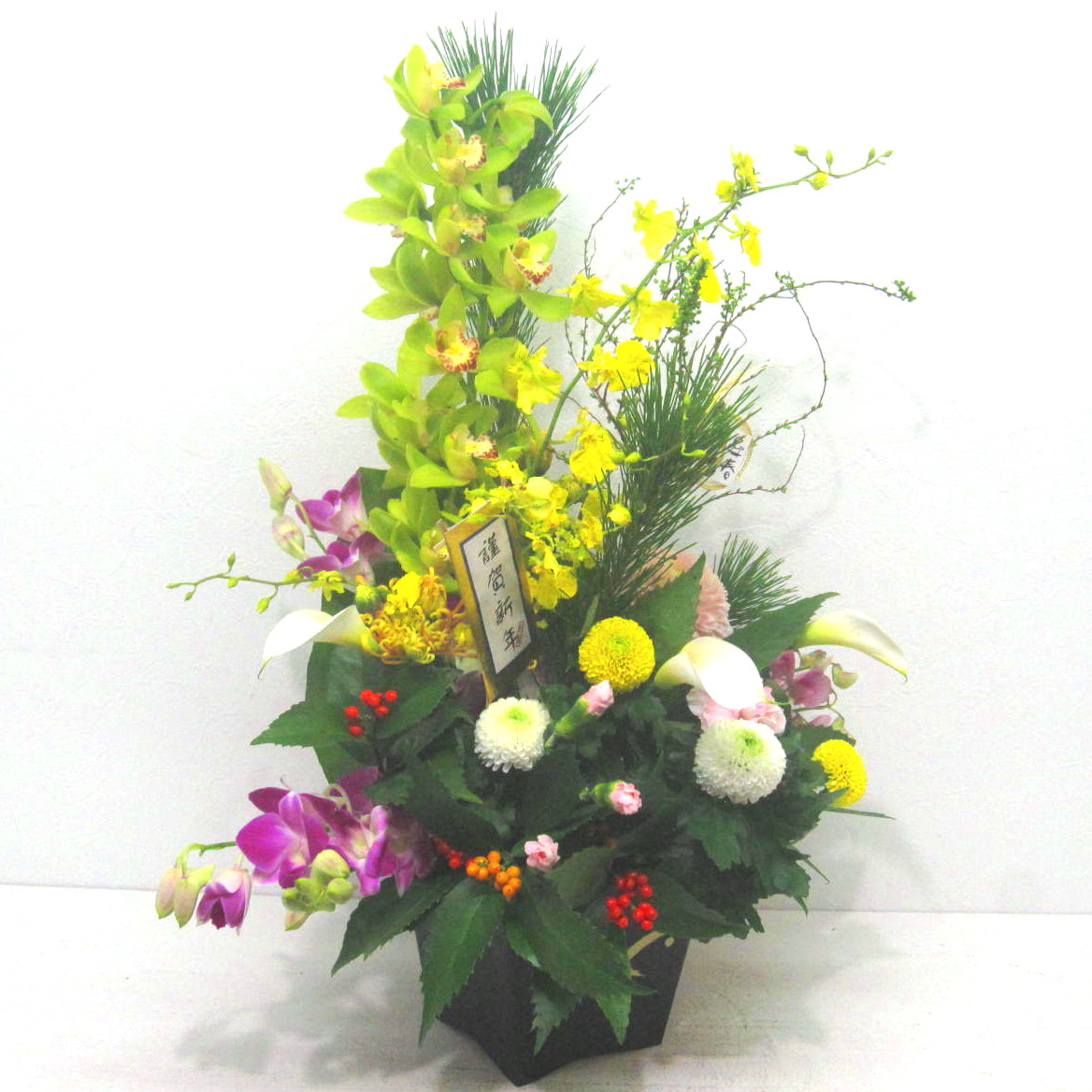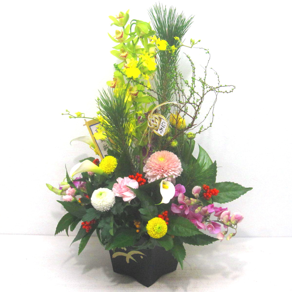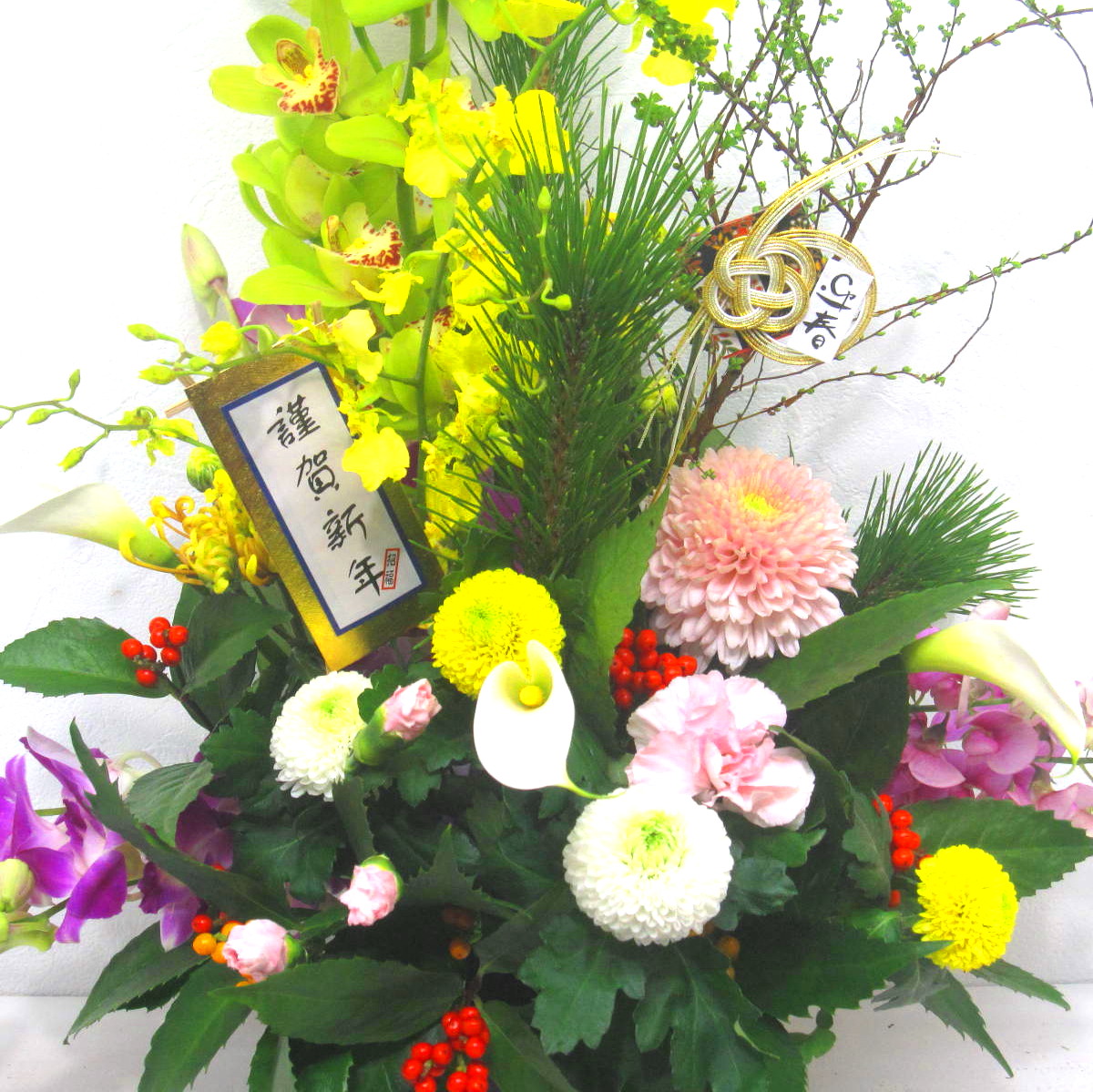 花材: メイン 松、千両、シンビジューム、マム、デンファレ、オンシジューム、ミニカーネーションなど その他 季節のお花、葉物類など