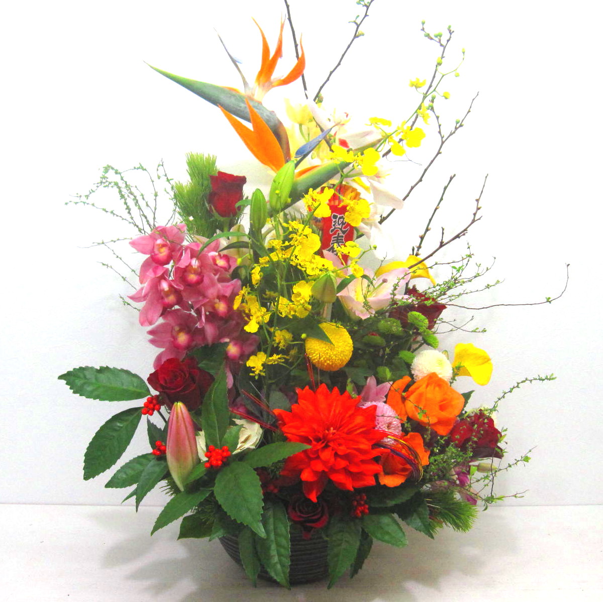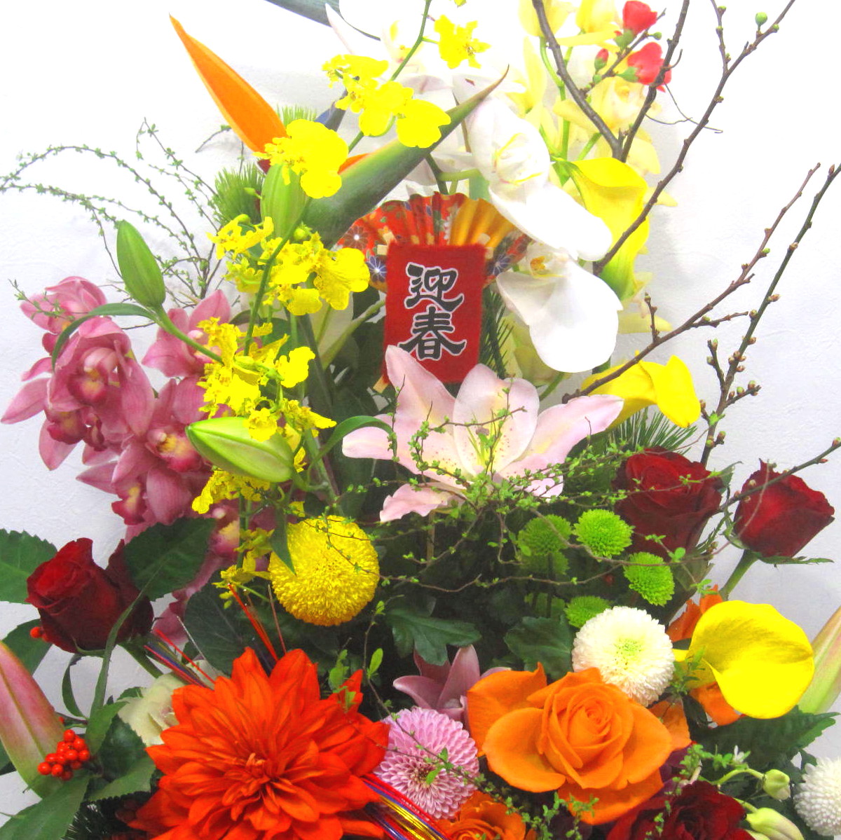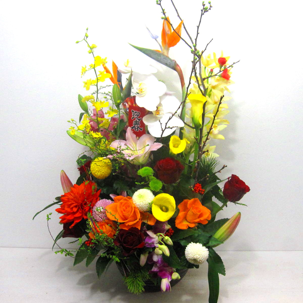花材: メイン 松、千両、ユリ、マム、バラ、デンファレ、コチョウランなど その他 季節のお花、蘭系のお花、葉物類など