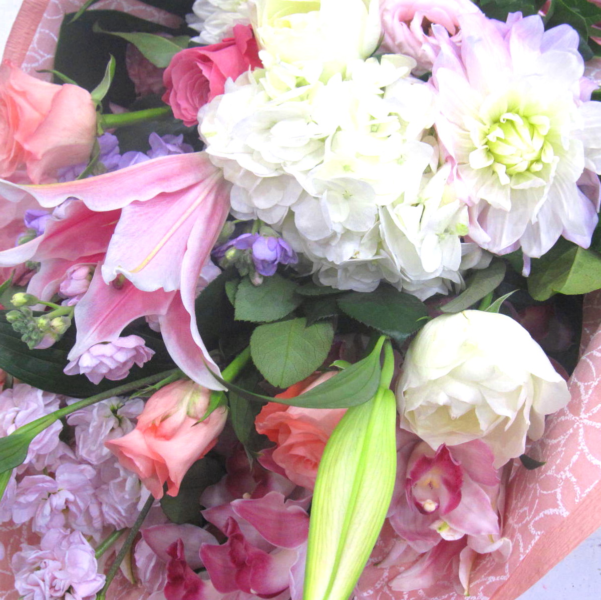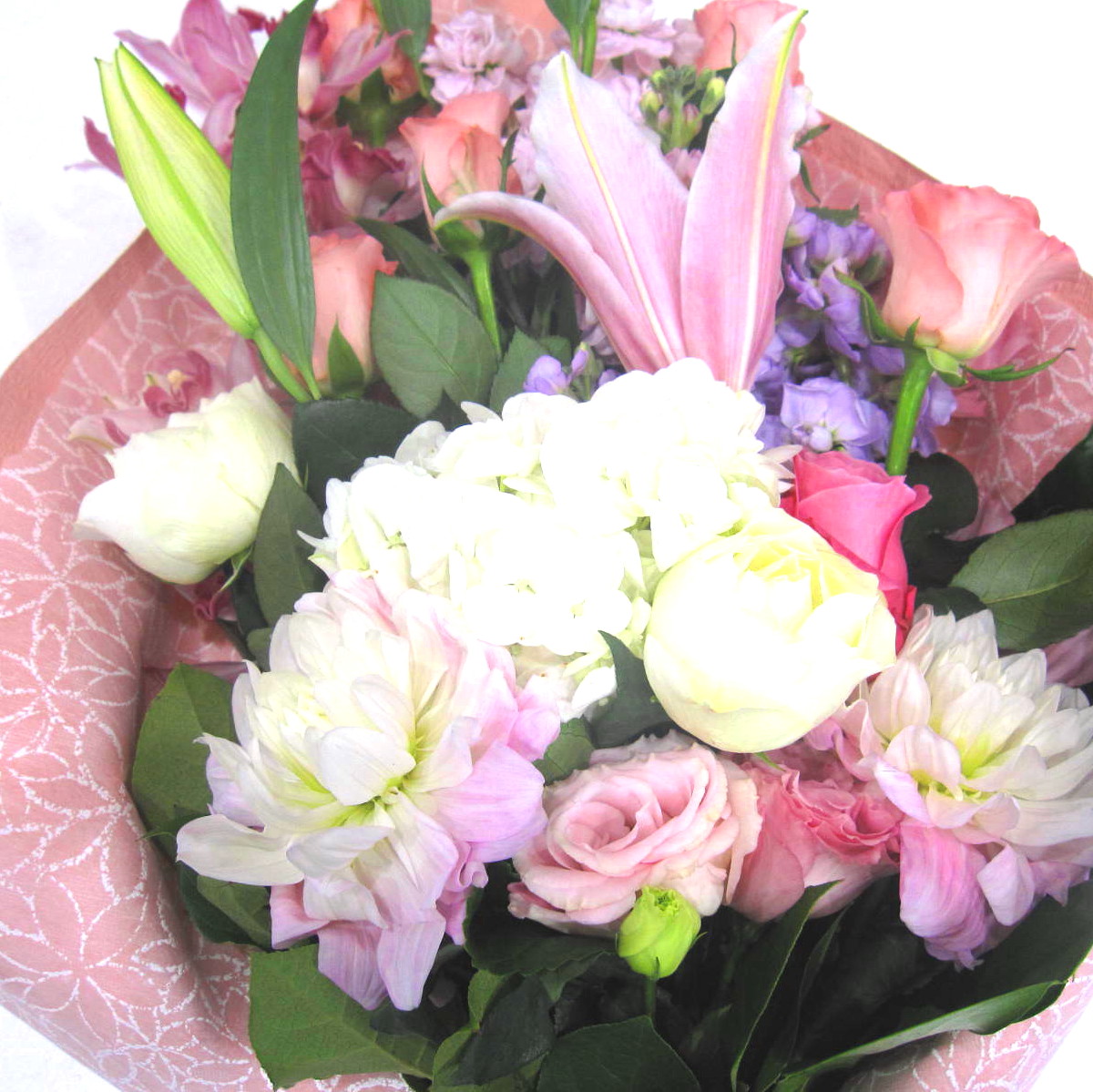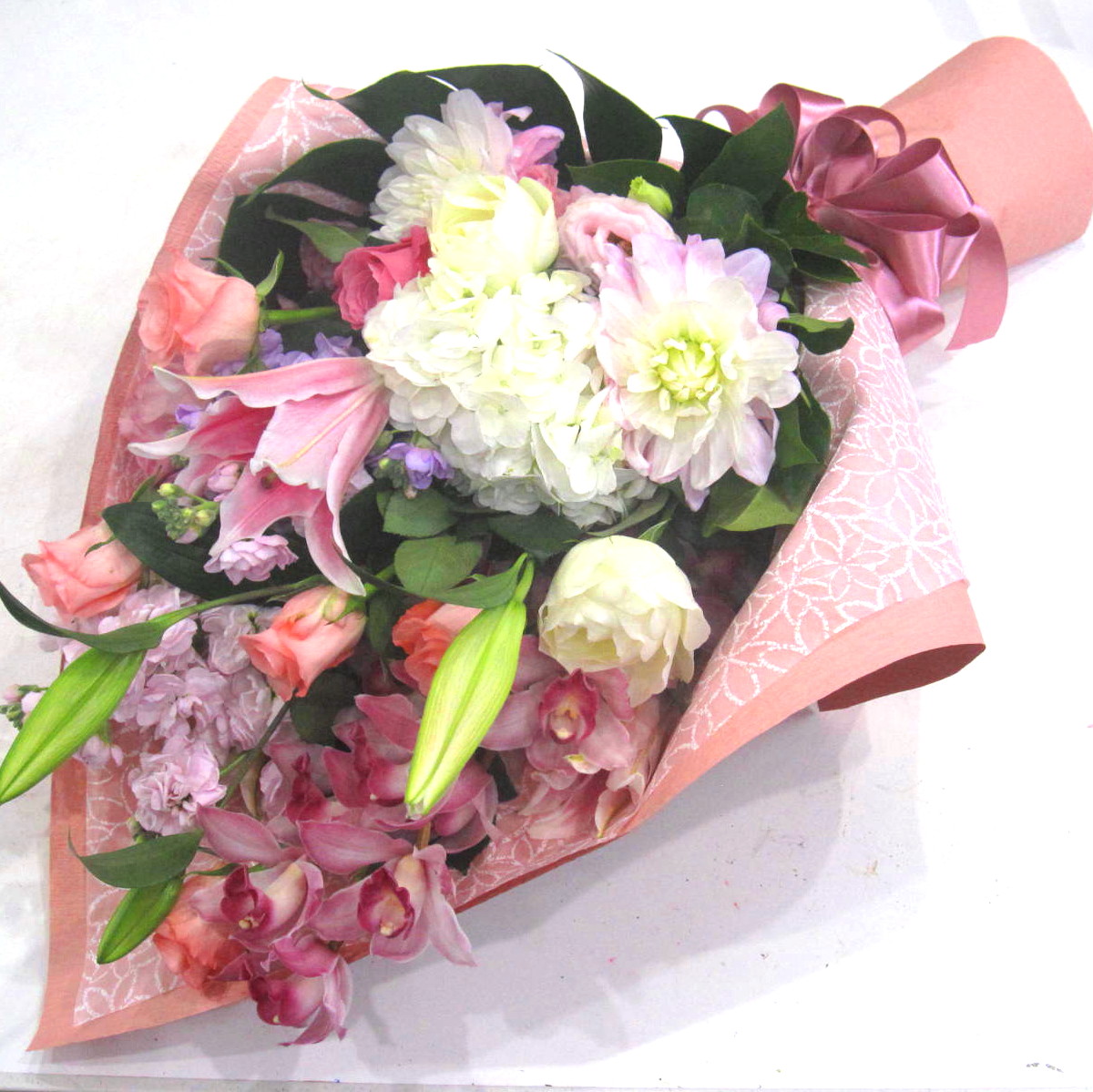 白&ピンク系のお祝い用にふさわしい華やかな花束です。存在感のあるユリやバラなどのお花はもちろんダリアやアジサイなどちょっぴり珍しいお花もいれて上品にお作りします。また、ご利用されたお客様から「大変花持ちが良い」と好評をいただいております。静岡県長泉町から日本全国【真心】込めてお届けいたします。さまざまなご用途に贈る贈り物としてオススメです。大切な方へ贈るフラワーギフトやプレゼントなら「花樹園オンラインドットコム」に是非、お任せ下さいませ。