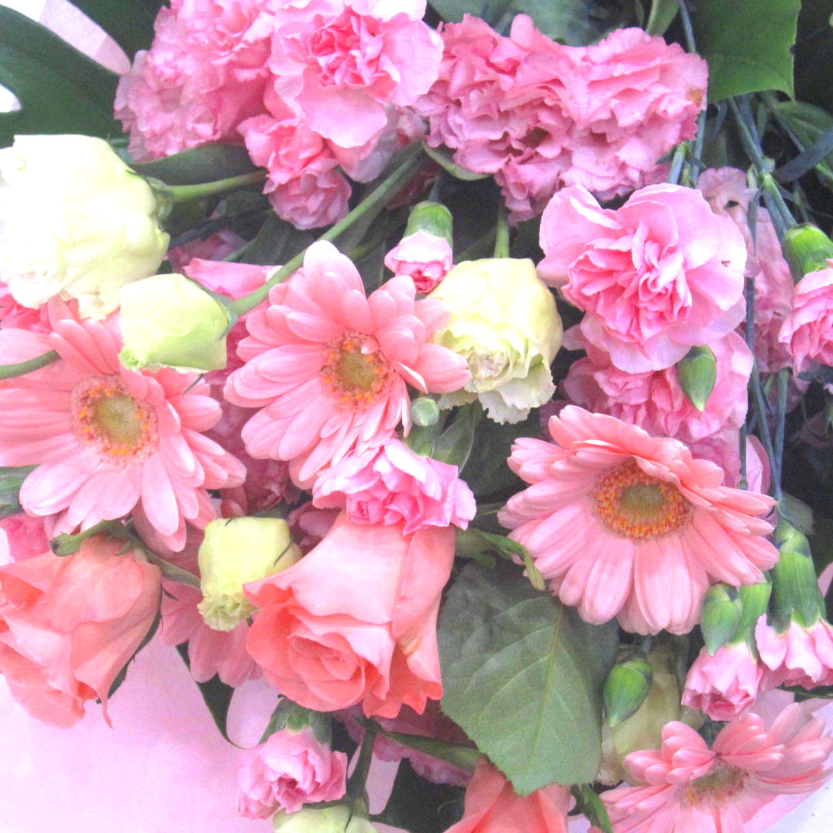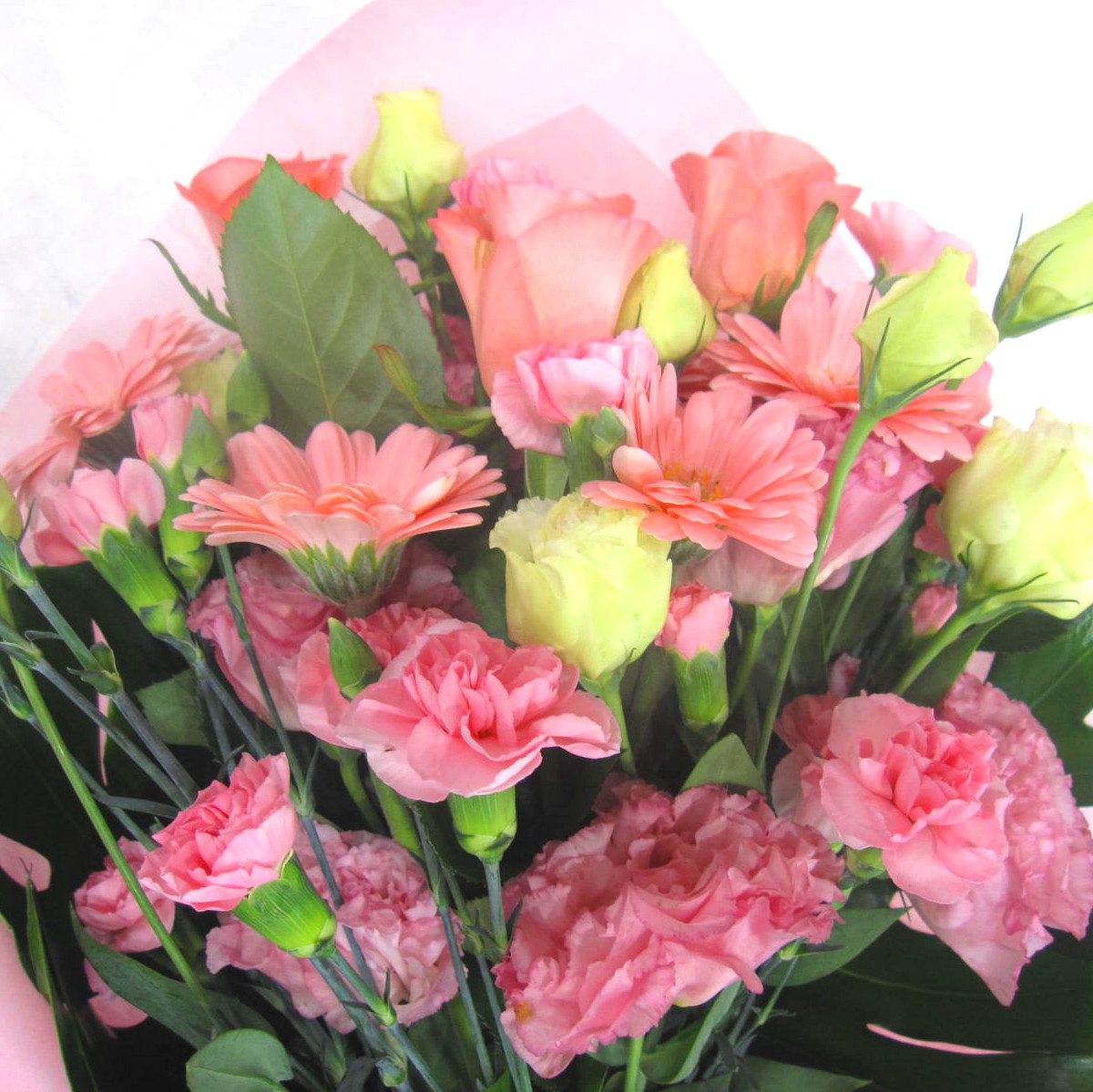 淡い優しい色合いのピンク系の花束。とっても明るい色合いが大切なアニバーサリーを彩ってくれますよ。【15時迄のご注文で翌日届きます】※こちらの商品についてのご相談、ご質問等ございましたら(メール)または(お電話)にて承ります。