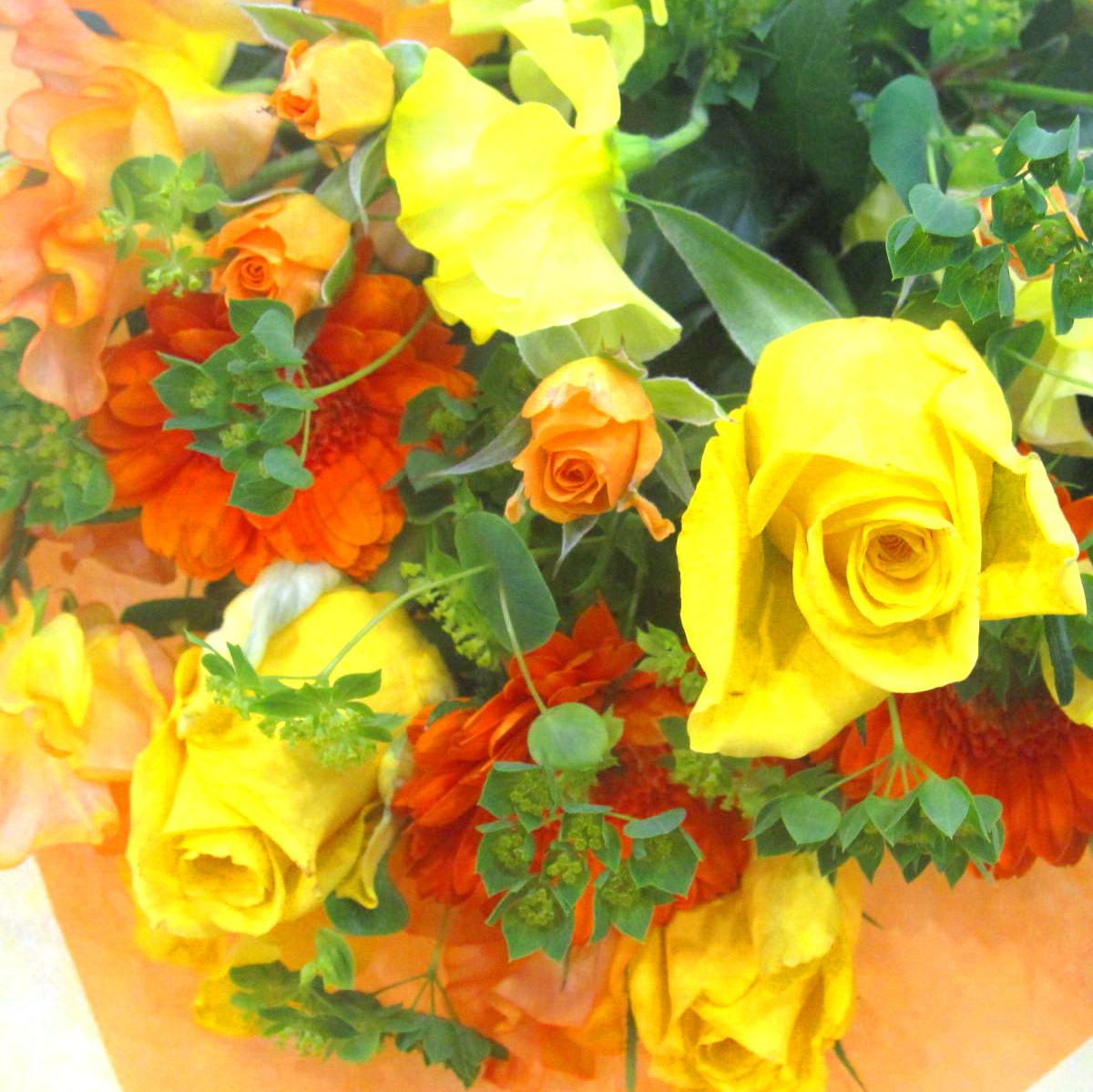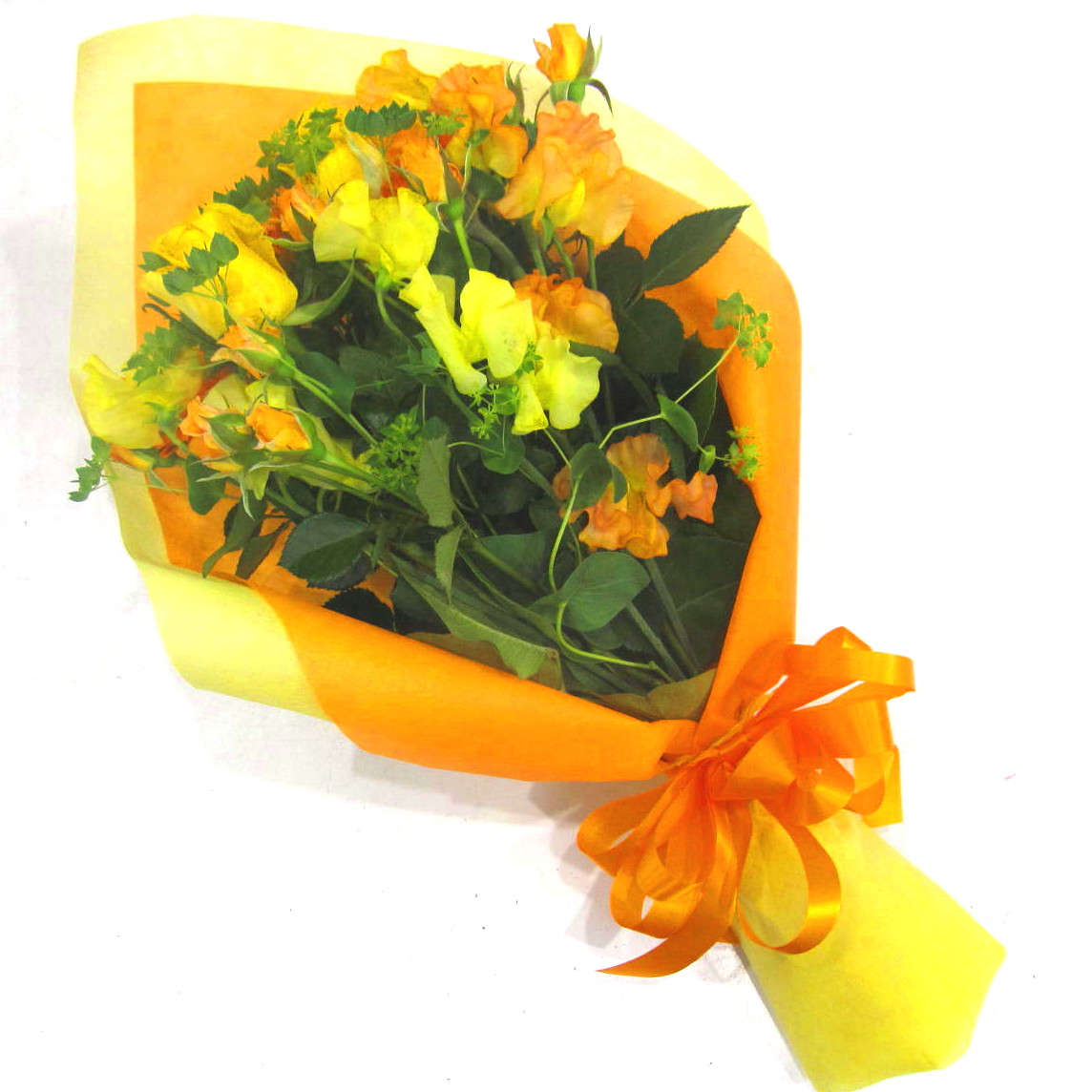 春のお花「スイートピー」を入れた黄色&オレンジ系の花束。とっても明るい雰囲気が春の訪れを感じさせてくれますよ。【15時迄のご注文で翌日届きます】※こちらの商品についてのご相談、ご質問等ございましたら(メール)または(お電話)にて承ります。