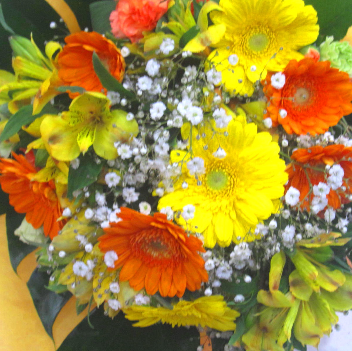 春のお花「アルストロメリア」を入れてガーベラを主体に黄色&オレンジ系でまとめた花束。ボリューム感もあり、春の贈り物にオススメです。【15時迄のご注文で翌日届きます】※こちらの商品についてのご相談、ご質問等ございましたら(メール)または(お電話)にて承ります。