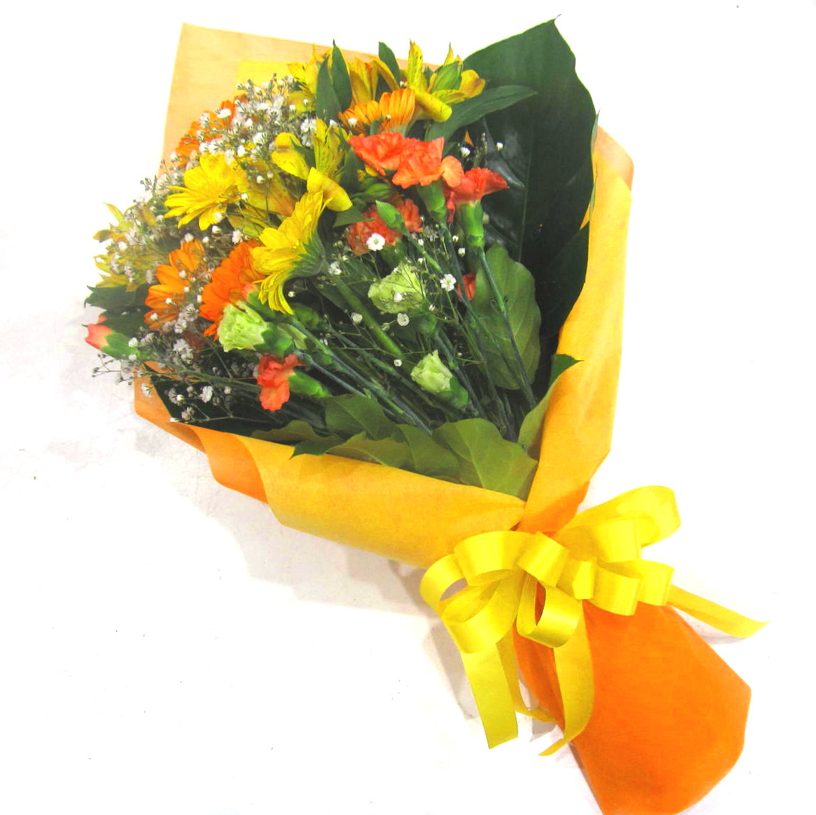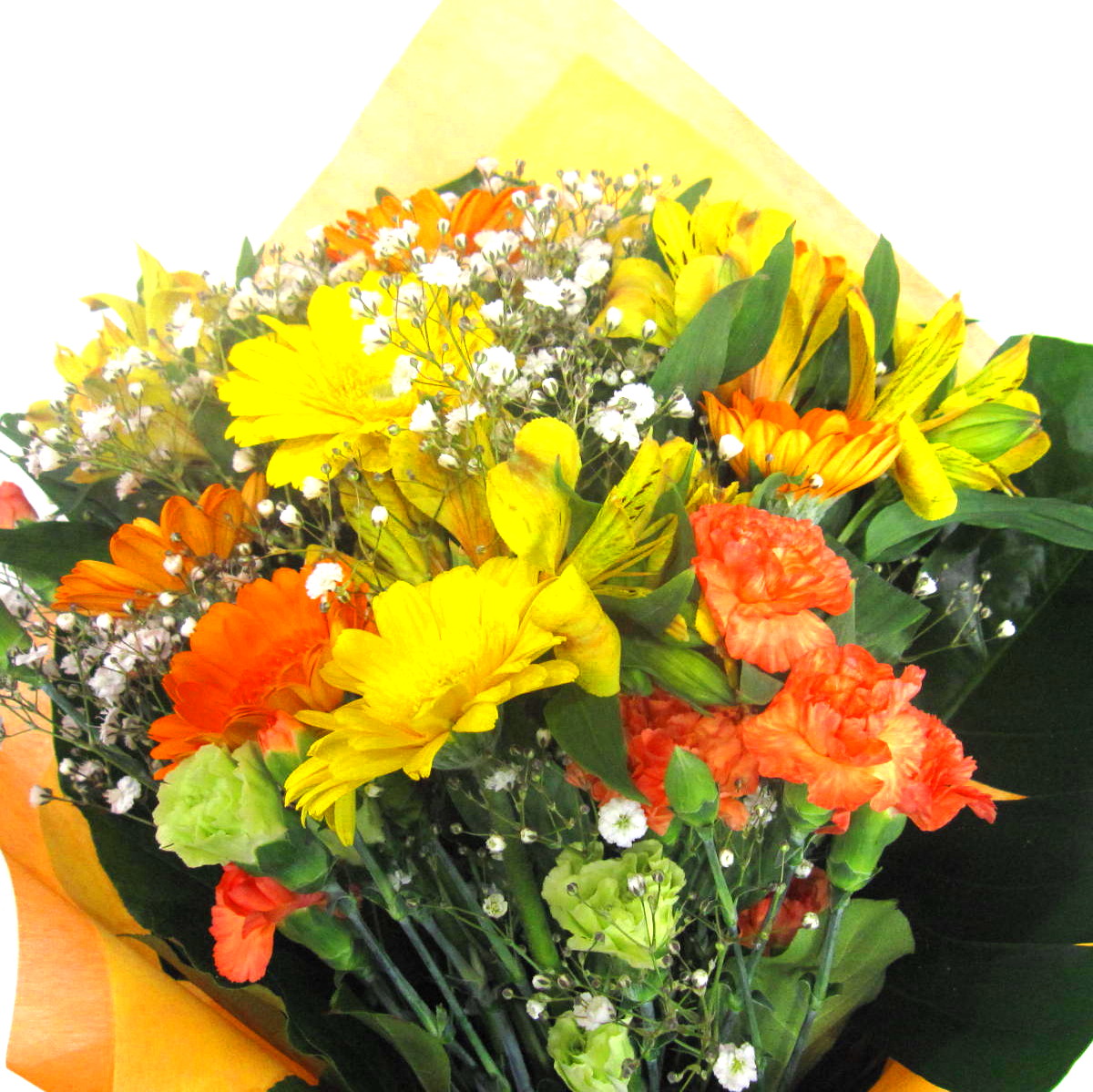 とっても明るい春らしい黄色&オレンジ系の花束です。ガーベラとアルストロメリアを主体にカーネーションやかすみ草とあわせてボリュームよくお作り致します。また、その日、入荷した持ちの良いお花を中心に使っておりますので花持ちも良いでしょう。ご購入されたお客様から高い評価を頂いております。静岡県長泉町から日本全国【真心】込めてお届けいたします。さまざまなご用途に贈る贈り物としてオススメです。大切な方へ贈るフラワーギフトやプレゼントなら「花樹園オンラインドットコム」に是非、お任せ下さいませ。