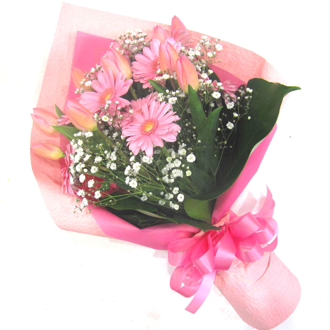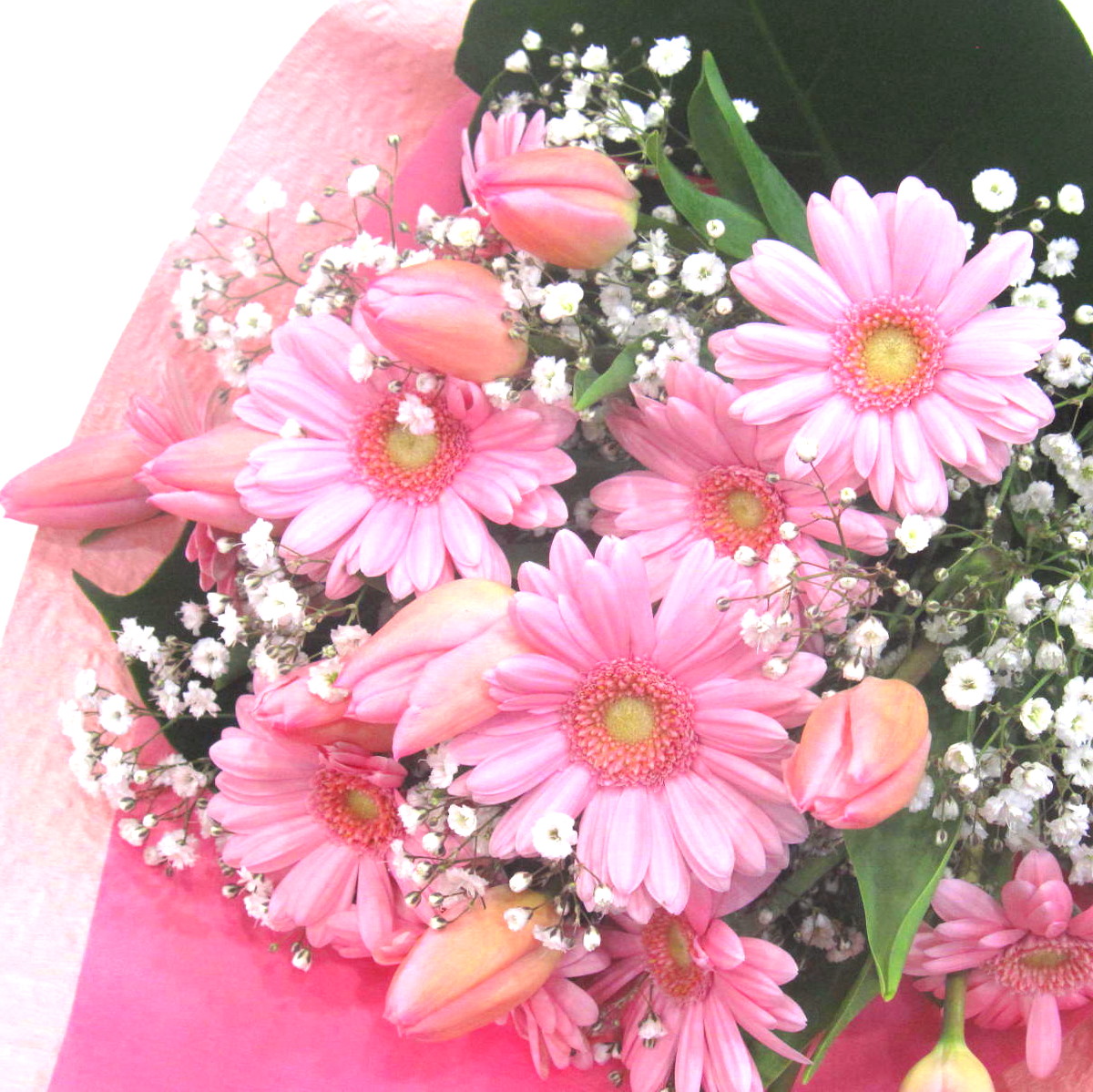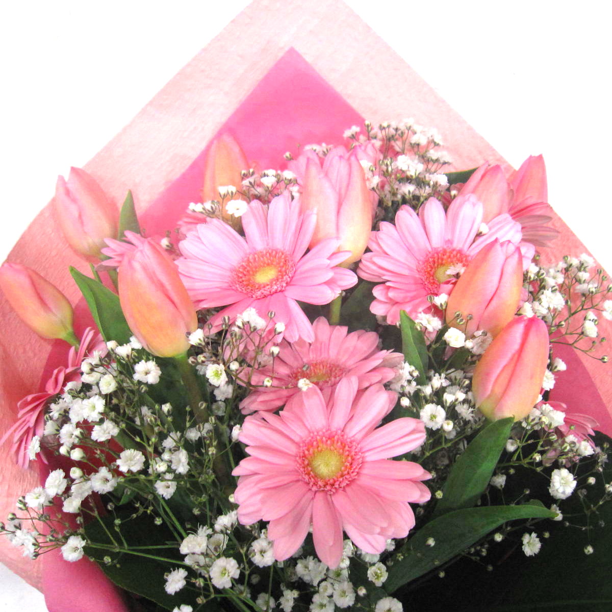 春を代表するお花「チューリップ」とガーベラ、かすみ草でまとめた春の可愛らしいピンク系の花束。春の贈り物にオススメです。【15時迄のご注文で翌日届きます】※こちらの商品についてのご相談、ご質問等ございましたら(メール)または(お電話)にて承ります。