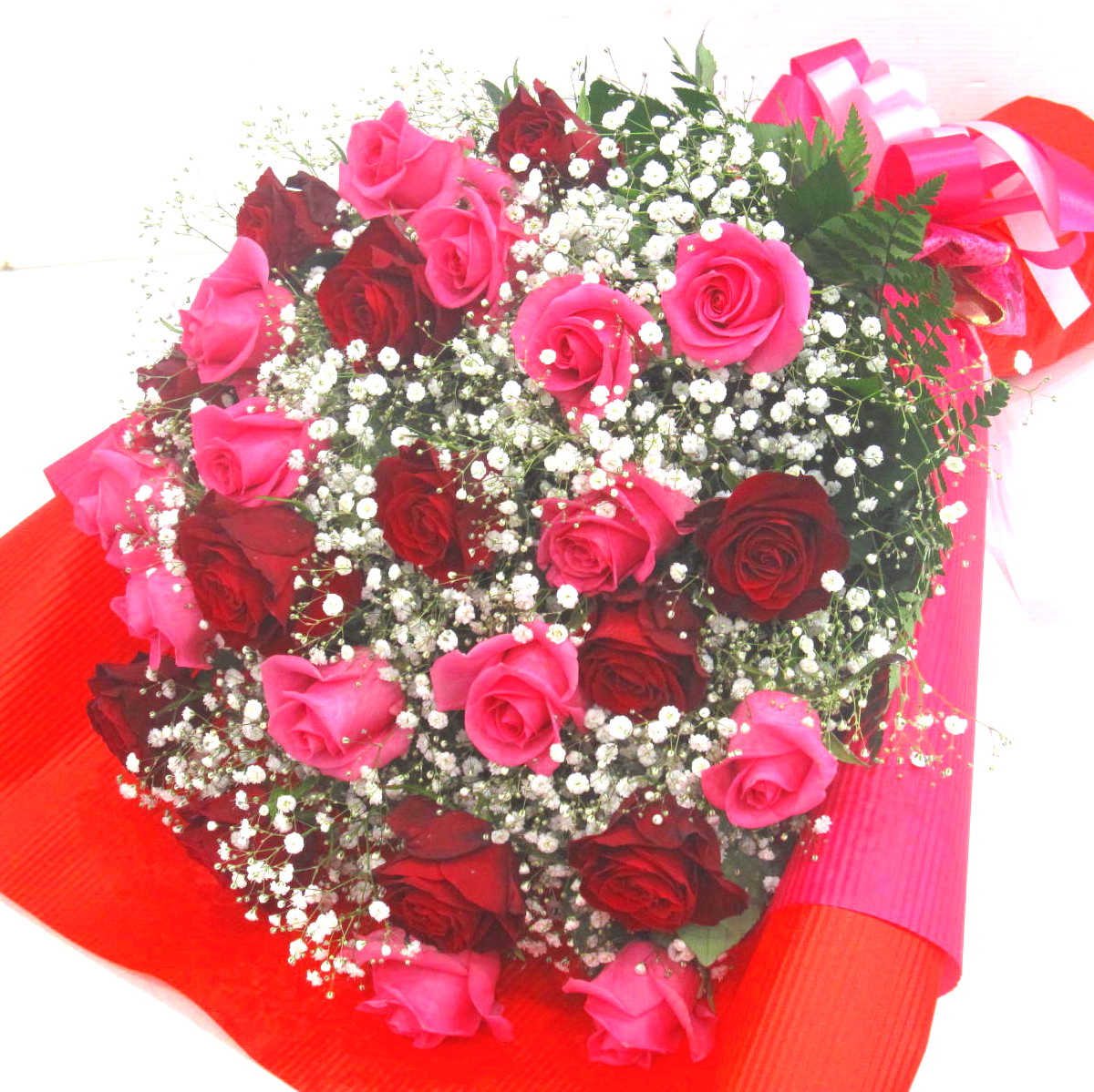 私達花のプロが販売する厳しい基準をクリアした国産バラを使用した赤いバラ12本とピンクバラ12本(合計24本)とかすみ草の豪華な花束になります。茎も太く、花も大きく咲きます。もちろん花持ちにも自信があります。ラッピングは上品な雰囲気をイメージし、レッド、アクセントにピンクを入れて可愛らしくかっこよくといった感じです。当店ではお客様の想いを大切に【こころを込めて】お作りいたします。静岡県長泉町から手渡しお届けまたは宅急便で全国にお届けします。是非、さまざまな贈り物に。